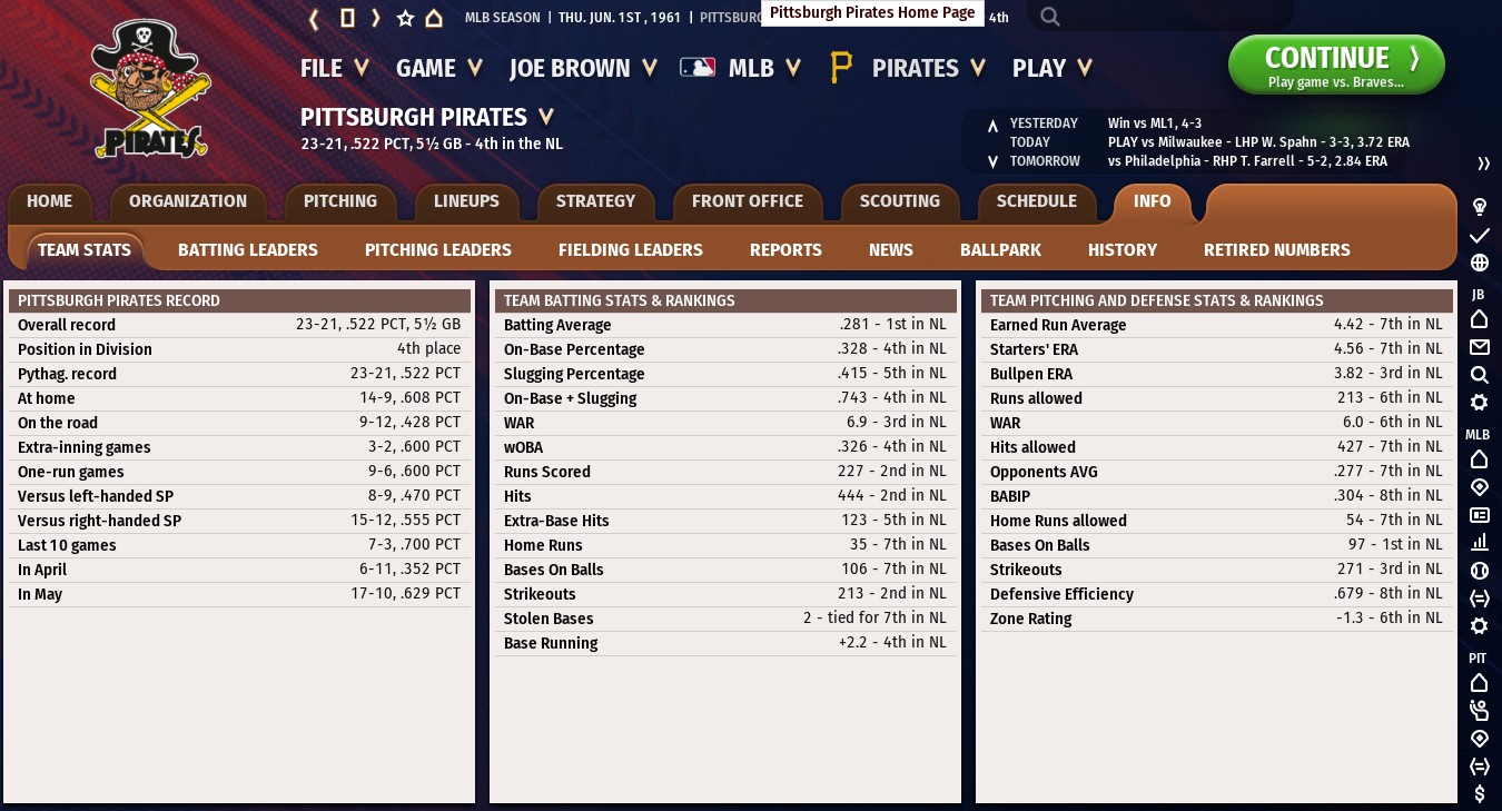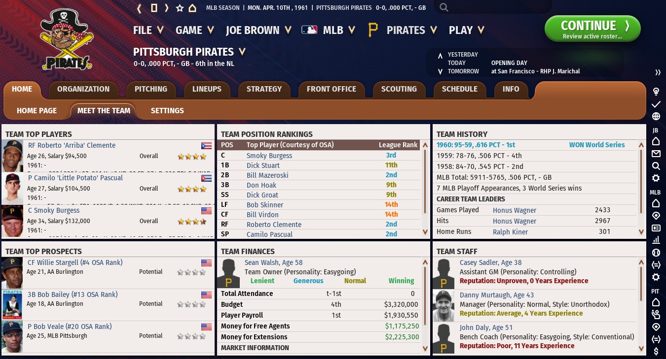 I'm starting in 1961, full minors, 3 rear recalc not weighted, development on, TCR 100, injuries normal (OOTP Classic), scouting normal, AI evaluation 50% on ratings 30% on current year 15 and 5, all psychology turned off, free agency applies. Due to real life success in 1960 OOTP assigns the Pirates a large market and high fan interest, fan loyalty, budget, and payroll. Consistent with the goal of the save I edited the the team ownwer to prioritize winning and to be generous with money. However Joe Brown doesn't get all the money as the owner sets the budget. Owner goals are off and Joe Brown can't be fired. OOTP made Danny Murtaugh manager. I made historically correct Joe Brown as GM (and gave him an experienced GM's salary). Teams didn't have scouts and there were none to hire so I used the button to auto create one scout for each opening. I didn't check other personnel positions but just in case did the same with them. (Taking the button as it is presented which is it wouldn't create personnel if there were no openings.) Recall that there is no off season. OOTP starts the save a couple days before spring training, so off season trades etc all have to happen in March. Joe Brown, Danny Murtaugh, etc, will talk in the language of and context of the time. When I post as me I'll include discussion of ratings, modern stats, and real life events. |