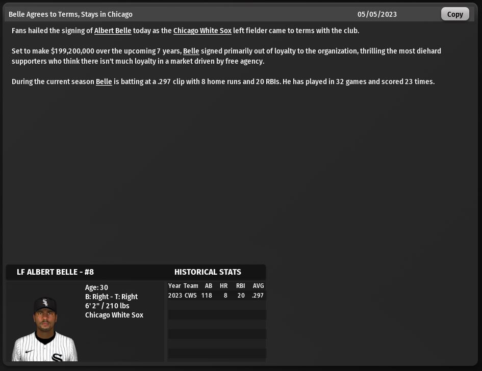 Trying to see how well of a White Sox GM I can be. Real White Sox players in the year that they debuted for the Sox. Sim only league. 27 man rosters. DH al only Extra inning rules in place. No draft. No extra players. I can only trade current Sox players for former Sox players.