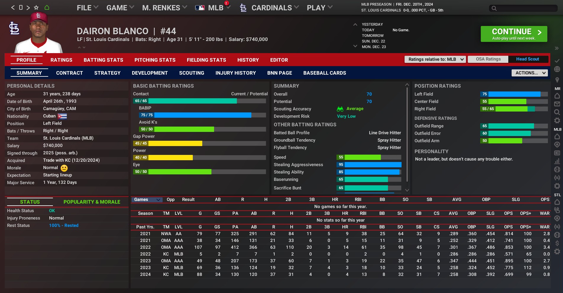 That run had ended with an ugly 71-91 campaign in 2023 -- the team's worst finish since 1995 -- and an 83-79 finish in 2024. Yes, the Cards' let former MVP first baseman Paul Goldschmidt walk in free agency. Free-agent lefty reliever Andrew Kitteridge also was allowed to exit. But other than that, the whole dang gang was allowed to return for 2025. That included former All-Star third baseman Nolan Arenado, who seemingly had taken a big step back in 2024. Along with over-paid starting pitchers Miles Mikolas and Steven Matz. (Although, Matz likely will primarily serve as a reliever this season). The return of those three players, really gum up the works in terms of a reset as young players looking to get their shot will be stuck either on the bench or in the minors. So, what I am going to do is start the season at the end of the off-season. The goal will be to get rid of Arenado before the start of the season and either one or both of Mikolas and Matz. Any money I recoup through trades I can use to add other players. But I cannot go over the $127,509,000 payroll ceiling set by the DeWitt family. I also may revamp the front office and coaching staff, since I don't have much faith in what they currently have in place. Last edited by rink23; 03-28-2025 at 02:03 AM. |