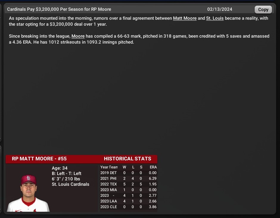 Cards news: February 13 -- LHP Matt Moore agrees to contract