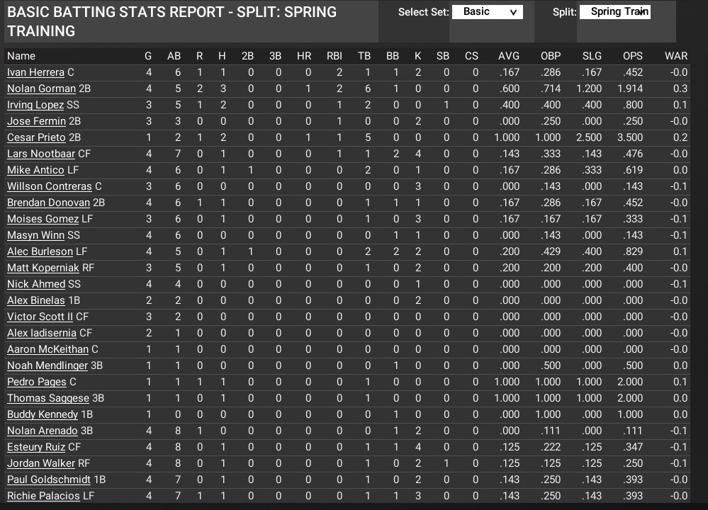 Cards news: March 3 -- Spring Training -- Team statistics after Week 1