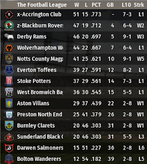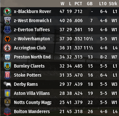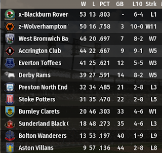 The first football league in history was The Football League which started in England in 1888. It had 12 teams which were as follow(using the names I put into OOTP): Accrington Club Aston Villa (Nicknamed Villans) Blackburn Rovers Bolton Wanderers Burnley Clarets Derby Rams Everton Toffees Notts County Magpies Preston North End Stoke Potters West Bromwich Baggies Wolverhampton Wolves The next post will contain the results from the first season of the simulation.
