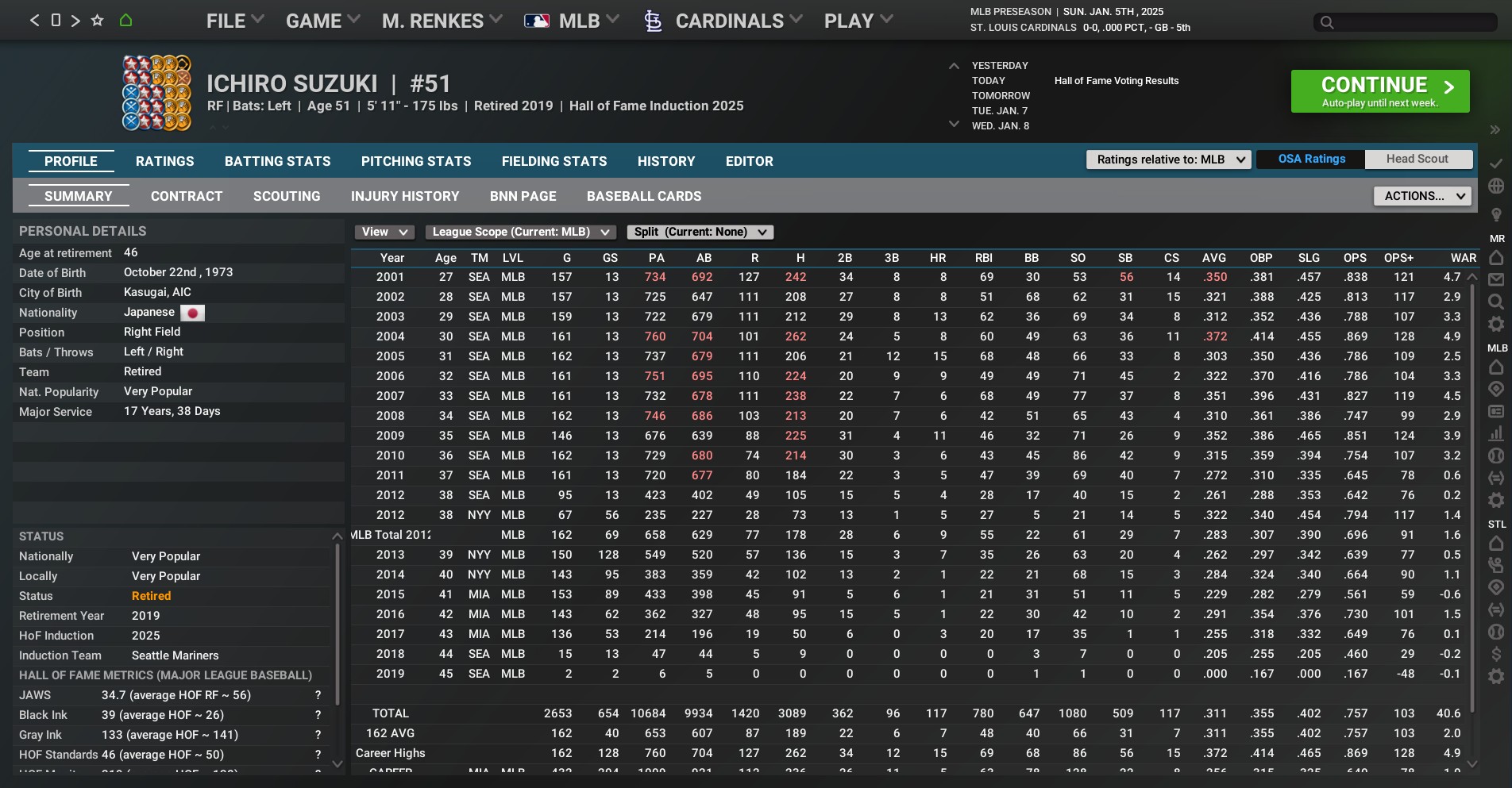 That run had ended with an ugly 71-91 campaign in 2023 -- the team's worst finish since 1995 -- and an 83-79 finish in 2024. Yes, the Cards' let former MVP first baseman Paul Goldschmidt walk in free agency. Free-agent lefty reliever Andrew Kitteridge also was allowed to exit. But other than that, the whole dang gang was allowed to return for 2025. That included former All-Star third baseman Nolan Arenado, who seemingly had taken a big step back in 2024. Along with over-paid starting pitchers Miles Mikolas and Steven Matz. (Although, Matz likely will primarily serve as a reliever this season). The return of those three players, really gum up the works in terms of a reset as young players looking to get their shot will be stuck either on the bench or in the minors. So, what I am going to do is start the season at the end of the off-season. The goal will be to get rid of Arenado before the start of the season and either one or both of Mikolas and Matz. Any money I recoup through trades I can use to add other players. But I cannot go over the $127,509,000 payroll ceiling set by the DeWitt family. I also may revamp the front office and coaching staff, since I don't have much faith in what they currently have in place. Last edited by rink23; 03-28-2025 at 02:03 AM. |