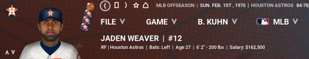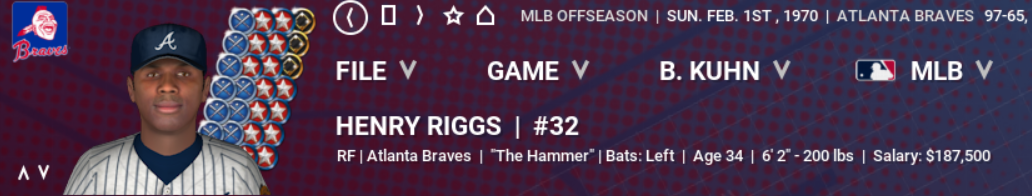 Postseason: Lost NLCS (3-0) to the New York Mets Ballpark: Fulton County Stadium (98 hits, 118 HR) Runs scored: 818 (1st) Runs allowed: 694 (6th) Pythag record: 93-69 (+4) Recap: The Braves made the postseason for the first time in franchise history, only to be unceremoniously swept by the Mets. History: The Braves have moved from Boston to Milwaukee and now Atlanta, and for the first chunk of their history they were terribad. Over the past several years, however, they've gotten close several times, most notably in 1965 when they went 100-62 but still finished 5 1/2 games back of the eventual World Champion St. Louis Cardinals. Outlook: They have to be considered the contenders to repeat but man, it's going to be a tough road. Already the pitching staff wasn't great last year and they lost their ace (and Cy Young Award winner) George House at the end of the season to a torn flexor tendon in his elbow that's going to keep him out for most of 1970. They've cleared out their outfield logjam to get pitching help but will it be enough? Rotation Code:
