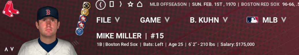 + -------- + --------------- + -------------- + ------ + ------- + ------ + ------ + ------- + ------- + ------- + -------- + ------- + -------- + ------ + -------- + ------- + ------- + ------- + ------- + -------- + ------- + -------- + -------- + | pos | first_name | last_name | g | ab | r | h | 2B | 3B | hr | rbi | bb | ibb | k | hpb | sh | sf | sb | cs | gdp | ba | obp | slg | + -------- + --------------- + -------------- + ------ + ------- + ------ + ------ + ------- + ------- + ------- + -------- + ------- + -------- + ------ + -------- + ------- + ------- + ------- + ------- + -------- + ------- + -------- + -------- + | 1B | Mike | Miller | 162 | 606 | 93 | 189 | 26 | 2 | 34 | 94 | 100 | 9 | 107 | 17 | 0 | 3 | 1 | 1 | 17 | 0.312 | 0.421 | 0.530 | | 1B | Ramon | Puig | 71 | 67 | 8 | 18 | 2 | 0 | 5 | 13 | 5 | 1 | 16 | 0 | 3 | 0 | 0 | 0 | 1 | 0.269 | 0.307 | 0.522 | | 2B | Dwayne | Fraser | 70 | 260 | 31 | 73 | 11 | 0 | 5 | 25 | 22 | 0 | 15 | 3 | 0 | 2 | 2 | 1 | 9 | 0.281 | 0.341 | 0.381 | | 2B | Jesus | Martinez | 72 | 216 | 29 | 48 | 7 | 0 | 5 | 32 | 49 | 3 | 39 | 1 | 1 | 1 | 0 | 1 | 5 | 0.222 | 0.366 | 0.324 | | 2B | Jonathan | Ward | 37 | 81 | 9 | 19 | 3 | 0 | 4 | 17 | 15 | 0 | 17 | 0 | 1 | 0 | 1 | 1 | 1 | 0.235 | 0.351 | 0.420 | | 2B | T.J. | Pritchett | 9 | 34 | 3 | 11 | 2 | 0 | 0 | 5 | 4 | 0 | 3 | 1 | 1 | 0 | 0 | 0 | 2 | 0.324 | 0.400 | 0.382 | | 2B | Mike | Runfola | 11 | 36 | 2 | 9 | 1 | 0 | 1 | 5 | 3 | 0 | 8 | 0 | 1 | 0 | 1 | 0 | 2 | 0.250 | 0.300 | 0.361 | | 3B | Mauro | Magoni | 151 | 587 | 71 | 138 | 20 | 2 | 17 | 68 | 50 | 0 | 88 | 5 | 0 | 4 | 2 | 1 | 29 | 0.235 | 0.299 | 0.363 | | 3B | John | Daughtry | 21 | 44 | 6 | 14 | 1 | 0 | 2 | 5 | 2 | 0 | 10 | 0 | 1 | 0 | 0 | 0 | 1 | 0.318 | 0.340 | 0.477 | | 3B | Troy | Carmer | 4 | 10 | 2 | 2 | 0 | 0 | 1 | 1 | 2 | 1 | 1 | 0 | 0 | 0 | 0 | 0 | 0 | 0.200 | 0.333 | 0.500 | | SS | Oniji | Handa | 155 | 690 | 83 | 200 | 21 | 0 | 17 | 67 | 23 | 0 | 23 | 2 | 0 | 6 | 0 | 1 | 19 | 0.290 | 0.312 | 0.394 | + -------- + --------------- + -------------- + ------ + ------- + ------ + ------ + ------- + ------- + ------- + -------- + ------- + -------- + ------ + -------- + ------- + ------- + ------- + ------- + -------- + ------- + -------- + -------- + Second base was never really a settled position after the team traded TJ Pritchett away - in retrospect it looks like they traded stability at one position for another (and also traded one very good young pitcher for another - man, that was a big trade). Neither Dwayne Fraser nor Arturo Jaquez look like they can field well enough to keep playing there as they move out of their primes but for now at least both are... somewhat passable at the keystone and whoever wins this spring training fight is sure to provide solid offense. Mauro Magoni followed up a breakout 1968 (.293 BA, 10 HR and 63 RBIs, and a 128 OPS+) with a disappointing '69 season. He opened the year by hitting .203 for the month of April and never quite got on track. He's a solid defensive contributor at third, so the Red Sox can live with the mediocre bat, but it's a make or break year for both the team and for Magoni coming up in 1970. Oniji Handa is not just a superlative hitter for a shortstop, he's also a monster fielder. By ZR (which, okay, didn't really exist in 1969 but how do you compare these guys!?) he saved 32.8 runs compared to the average player (tbh I don't think I've ever seen a guy with ratings that extreme - in game terms this was a new MLB record, passing Ryan Dietrich's 29.6 set in 1964) and set a new record for assists at the position, breaking the previous record by 27 (Chris Adams of the California Angels also surpassed the old record this season, although he had "only" 544 to Handa's 568). Also he set a new league record for at-bats with 690 but that's more of a function of the facts that a. he never left the field, b. he hit 2nd all season long for a very good offensive team, and c. he puts basically everything that comes within 10 feet of the plate into play. Outfield Code: