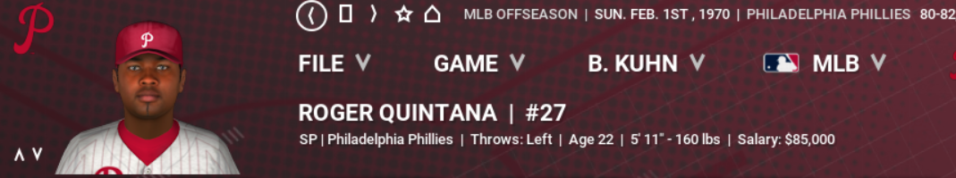 Postseason: -- Ballpark: Connie Mack Stadium (99 hits, 100 HR) Runs scored: 695 (6th) Runs allowed: 719 (8th) Pythag record: 79-83 (+1) Recap: Since winning the World Series in 1966 the Phillies have sat right around .500 every season. This trend continued last year. They were a serious contender in the East but they were never awful either. History: The Philies' history is a long history of also-ran statuses peppered by two World Series titles in 1954 and 1966. They've been consistently average during their time in the league, having lost more than 90 games just twice in their history (1947 and 1964) while having hit the 90 win mark just 3 times (the two WS seasons plus 1956, when they finished 90-56 and lost out to the Brooklyn Dodgers in a one-game playoff). Outlook: The Phillies participated in the blockbuster trade of the offseason, shipping off their superstar catcher John Stuart and receiving C Lee Citro and CF Joel Schaben in return. I think they got the better end of this deal in spite of the fact that Stuart is far and away the best player involved in this deal. Did they get enough better to contend for a 3rd pennant? Unlikely. In real life this was also the year they moved into Veteran's Stadium in midseason. However, since Seamheads only has 3 year averages for Shibe/Connie Mack, and since I don't like to switch out stadia in midseason, they'll play in the old environs for one more year. Rotation Code: