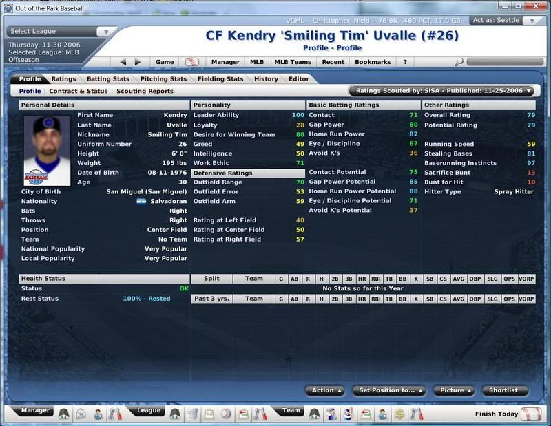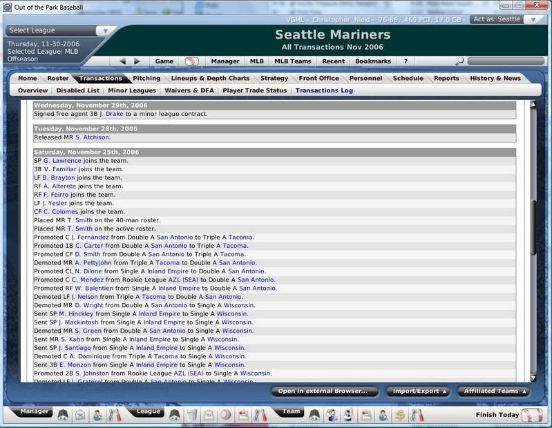 We're using OOTP 2007 Patch 2. The league was started with OOTP 2006 using a 2006 MLB roster set, possibly Rolen's. The upgrade occured about 3-4 sims prior to this "event", and everything went smoothly.