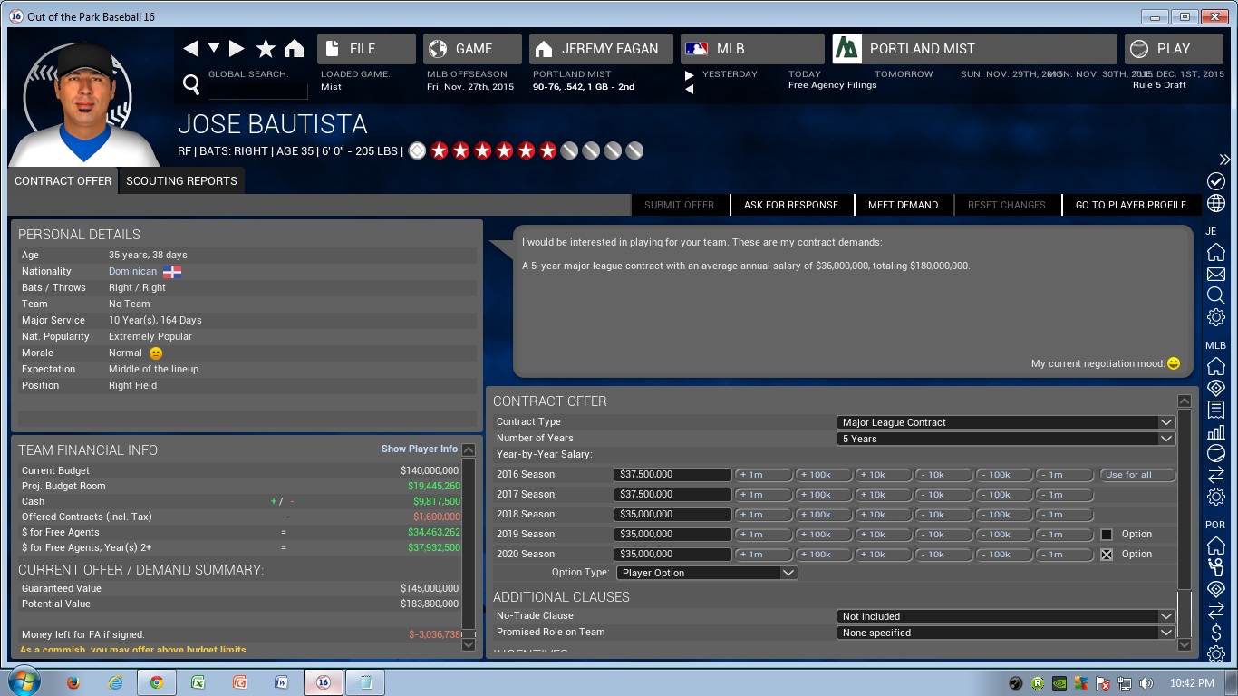 EDIT: I offered Bautista 15M per for 3 years and he countered with 34M per Though I'd get him at least into the 20's.