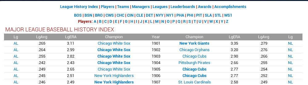 In my last league, the St. Louis Cardinals dominated. In this one, it is all South Side of Chicago. (I am piloting the New York Highlanders.)