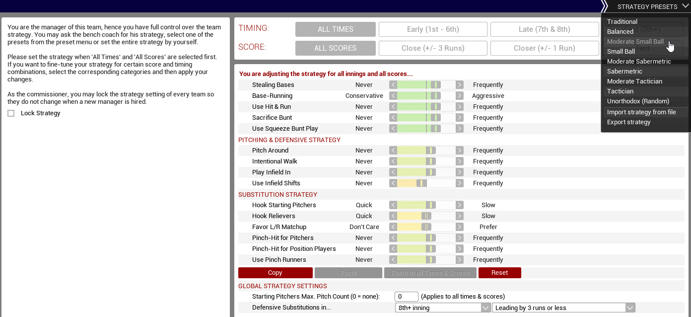 The fine-tuning choices are all still in there - look for the buttons on the top right. Whatever you set for ALL TIMES and ALL SCORES will, of course, override whatever you set for those special situations. Also, if you are managing and you ask your bench manager for his strategies, those will override as well. Finally, the STRATEGY PRESETS will override everything, too. So, start by setting the overalls, then fine-tune the special situations to your satisfaction.