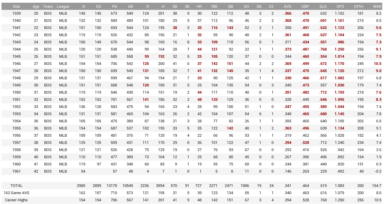 This time through his career he ended up with 3 Triple Crowns, including back-to-back TCs in 47 and 48. He won the MVP a record 11 times, compiled 18 All-Star Selections, and making it so the Curse of the Bambino was never a thing, by leading the Red Sox to 3 World Series Championships. When I did this I was assuming he was going to end up with a ton of hits, and he did (3,594), but what I wasn't really expecting was his power surge. Not only did he erase the Curse of the Bambino, but he also bumped him down the HR Leader list by finishing his career with 727 long balls. The only thing really lacking from his career this time though was a .400 season. Though, he did come close in 1957 at 38 years old when he finished the year at .396. ![]()