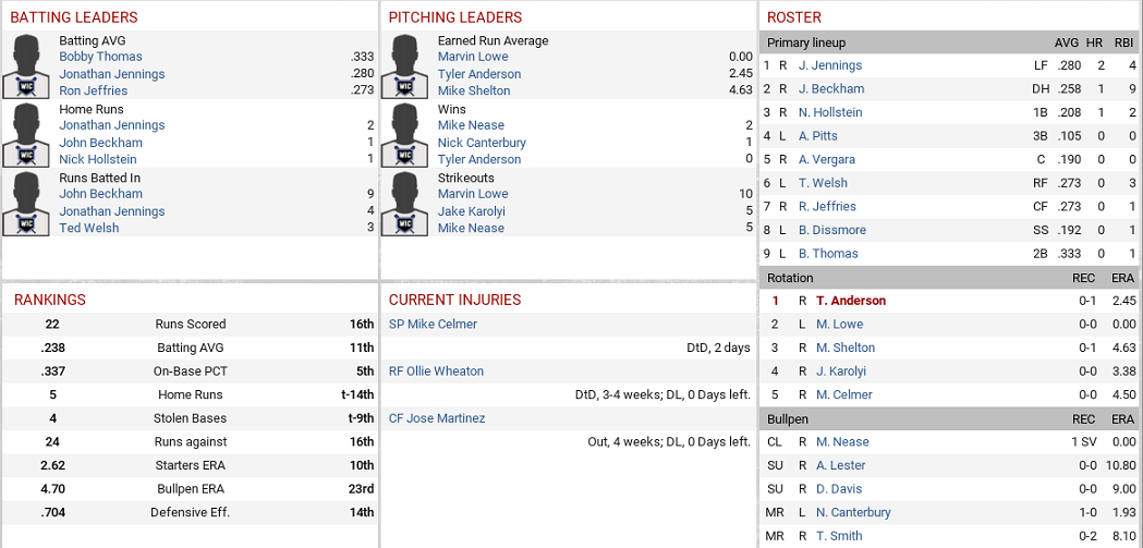 That's all I've got time for now, I need to get some screenshots up, as well as do a very quick review of our reserve roster, plus we have a couple players on the DL. I'll try to work on that tomorrow.