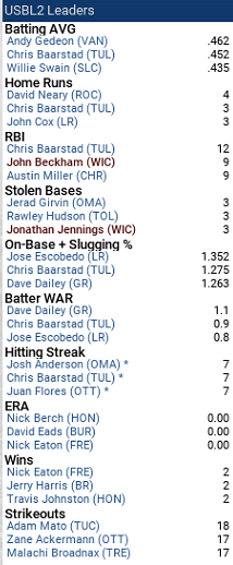 Wranglers under .500 after opening week of USBL2 season It was the best of times, and it was the worst of times for the Wichita Wranglers this week. Hey, seems to me part of that was a quote for a very famous, best selling book. Hmm. Anyways, Wichita ended the week 3-4, giving them a 3-4 record on the season, 15th place in the USBL2, 4 games out of 1st place, and 3 games out of promotion contention. They ended the week with a power ranking of 75.1, good for 14th in USBL2. The Wranglers opened the season in Tulsa, as the bullpen faltered, with Allan Lester and Tony Smith giving up 3 runs combined in the 8th inning as the Wranglers lost their season opener 4-3. Game 2 in Tulsa had much the same result, as John Beckham had a hot bat, going 2-4 with 3 RBIS, but it wasn't enough as the Wranglers fell short, 5-3. The Wranglers would try to salvage a win in game 3 of the series, but controversy ensued. Tyler Anderson gave up 4 runs, but only 2 of them earned, although he did walk 5 and throw 2 wild pitches. Now to the controversy, as with the Wranglers down 4-3 and a runner on first in the top of the 9th, heavy rains came, forcing a long postponement. After much deliberation, umpires decided to call the game, giving the Wranglers a 4-3 loss before they had a chance to complete their at-bat in the 9th. With that sour taste in their mouths, the Wranglers headed home to host the Burlington Hunters in a 3 game series. Game 1 needed 10 innings, but a Bobby Dissmore walk-off single in the bottom of the 10th gave the Wranglers their first win of the season, and the first win of their existence, 3-2. Game 2 of the series also went the Wranglers way, as they scored 2 in the 5th and 2 in the 6th to snatch a 5-4 victory. They would go for the sweep in game 3, and an incredible pitching performance from Marvin Lowe would put them in position. Lowe went 8 1/3 innings and gave up just 3 hits, and Mike Nease came on to get the last 2 outs. Nick Hollstein went 3 for 4 and drove in the only run of the game as the Wranglers won a 1-0 pitching duel. Back to .500 on the season, the Wranglers ended the week with the start of a 3 game series, travelling to take on the Baton Rouge Bears. Game 1 of the series would end the week, and once again the bullpen faltered. Dave Davis and Tony Smith combined to give up 3 runs in the 8th inning, costing the Wranglers in a 5-4 loss. Who's Hot, Who's Not Hot Weeks LF Jonathan Jennings -- Jonathan had a solid week, batting .280 with 2 HR and 4 RBI, and he also stole 3 bases. 3B John Beckham -- Don't spend so much time looking at the .258 average for the week, John leads the team by a wide margin with 9 RBIs, meaning when he had runners in scoring position, he got them in. SP Marvin Lowe -- A great week for Marvin, who didn't give up a run in 2 starts. 14 1/3 innings of work, but unfortunately because of the lack of run support, he didn't get a win to show for it. CL Mike Nease -- Mike was sensational in his closing role, not allowing a run in 3 1/3 IP, and notching 2 wins and 1 save. Cold Weeks 1B Nick Hollstein -- A week to forget for Nick, who many think should be the best player on the team. He batted just .208 with 12 stikeouts. C Adan Vergara -- Adan is 1 of 2 free agent signings that struggled this week, as he batted just .190 with 9 strikeouts. 3B Ayden Pitts -- Ayden was the pits this week, batting just .105, and getting just 2 base hits. He did walk 5 times, but it's not good when 2 of the 3 free agent pick-ups both have bad weeks. RPs Tony Smith, Dave Davis, Allan Lester -- These 3 get lumped together because they are the main reason the bullpen ERA was 23rd out of 24th this week. Tony had an 8.10 ERA with 2 losses, Dave had a 9.00 ERA, and Allan had a 10.80 ERA. Although to be fair to Allan, that damage was done in his first appearance, and he didn't allow a baserunner in his last 2 appearances. Around the League Awards USBL2 Player of the Week: Chris Baarstad (Tulsa)- .452, 3 HR, 12 RBI, 5 runs scored. |