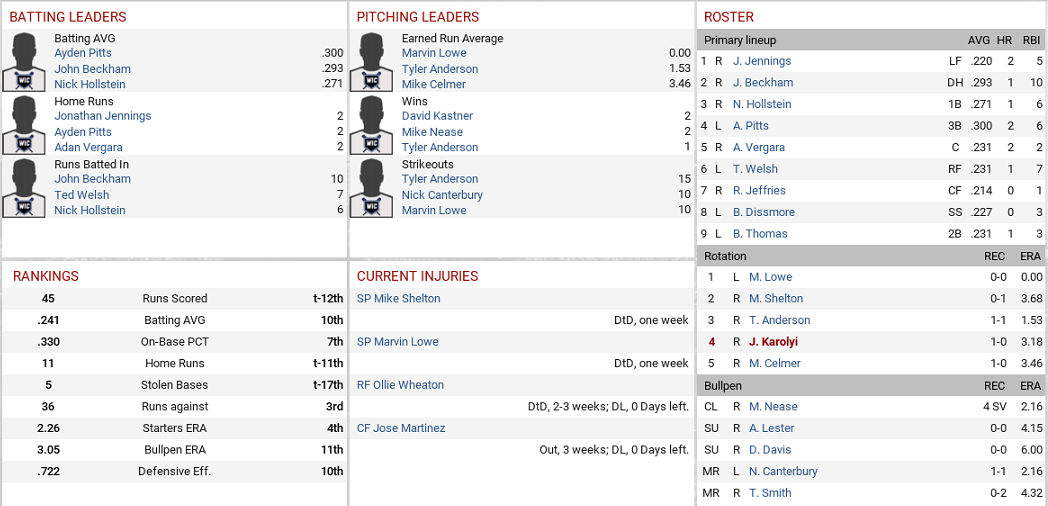 Wranglers only lose 1 game this week, but see 3 pitchers injured Record wise, it was a much better week for the Wichita Wranglers, who went 5-1 this week and now have an overall record of 8-5. This puts them in 6th place in USBL2, 3 games out of both first place and 2 games out of promotion contention, The downside to the week is the injuries of 3 starting pitchers, but fortunately, none of them will require a long DL stint. More on that later. (I have decided not to focus so much on the power ranking, owner mood, and fan interest every week, instead touching on those occasionally during bi-weekly coaches shows and such). The Wranglers started the week with 2 more games in Baton Rouge. Game 2 of the 3 game series was dominated by the Wranglers. Starting pitcher Tyler Anderson was the first of 3 injuries for Wichita this week, as he left the game in the 3rd inning due to a mild strain in his oblique. David Kastner picked up the slack out of the pen, going 4 1/3 innings and allowing just 2 hits and 1 run. Meanwhile, Ted Welsh was 2-4 with a homer and 3 RBIs as the Wranglers rolled to a 7-2 win. The 3rd and final game of the series, and the tiebreaking game, so to speak, saw Bobby Thomas and Ayden Pitts each have 2 RBIs as Wichita got a 5-3 win. From there, the Wranglers went back home to host the Boise Bombers in a 3 game series. Game 1 saw Mike Celmer go 7 innings of 6 hit, 2 run ball, and Allan Lester and Mike Nease pitched the 8th and 9th respectively. Nick Hollstein had 2 RBIs and Adan Vergara hit his first homer of the season as the Wranglers won 4-2. Game 2 of the series saw the 2nd of the starting pitcher injuries, as Marvin Lowe didn't make it out of the 1st inning, leaving with a strained forearm and he is day to day for the next couple weeks. The bullpen did an admirable job, however Mike Nease gave up 2 runs in 1 2/3 innings of work, blowing a save. The Wranglers would rally in the bottom of the 9th, getting the game tying run on an Ayden Pitts RBI single. It wasn't enough though, as the Wranglers fell 4-3 in 11 innings. Game 3 and the series deciding game saw our final injury of the week, as Mike Shelton left after 3 innings with a herniated disc in his back, an injury that might cost him a couple starts and a stint on the 10 day DL. The worst part: he was throwing a no-hitter when he got injured. The bullpen combo of David Kastner, Nick Canterbury, Allan Lester, and Dave Davis was absolutely brilliant, allowing just 1 hit in the last 6 innings. Davis got the save in a 2-0 Wranglers win! After a day off, Wichita headed up to face the El Paso Diablos. The week ended with game 1 of the 3 game series, which was a masterful pitchers duel. Tyler Anderson went 8 innings of 4 hit ball, striking out 10, and Mike Nease pitched a perfect 9th for his 4th save of the season as the Wranglers squeaked out a 2-1 win with RBIs by Nick Hollstein and Adan Vergara. Our first GM/coaches show with Mike Schaplowsky will be the next post, and Mike will talk about the injuries to Lowe and Shelton and how he will handle them, among other things. Who's Hot, Who's Not Hot Week 3B Ayden Pitts- After a slow start last week, Ayden absolutely tore it up this week. All he did was bat .476 going 10 for 22 with 2 HR and 6 RBI. Surprisingly, that wasn't good enough for the USBL2 Player of the Week award. The entire pitching staff- Rarely will you see an entire staff hot in the same week, but that's what you had here. The staff ERA for the week was a whopping 1.93! Half of the staff had an ERA of 1.00 or less. Only 2 players had an ERA of higher than 3.00. Even those players had a couple quality innings so I'm not going to single them out. How good was it overall? After last week, the bullpen ERA was 23rd out of 24 USBL2 teams. After this week, the bullpen ERA is 11th of 24 teams. You can beat GM/Coach Schaplowsky will want to discuss that! I think I'm going to definitely change this up, as I could easily put every player on either the hot or cold list for the week, so I think I'm just going to mention hot or cold streaks if the game mentions it. In this case, Ayden Pitts was the only one, but I had to give credit to that pitching staff! Around the League Awards USBL2 Player of the Week: LF Javy Banuelos (Salt Lake City)- .435, 4 HR, 11 RBI. |