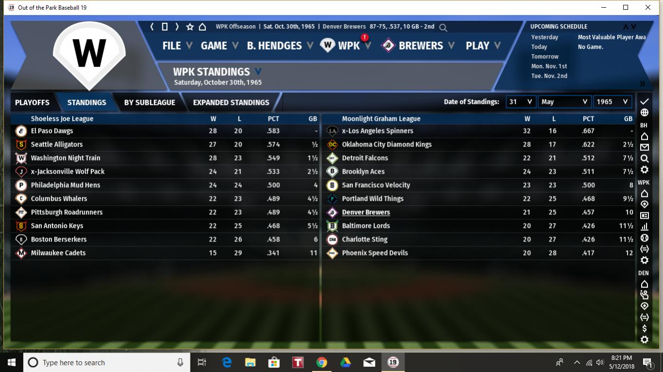 The Denver Brewers play in the Moonlight Graham League which is one of two sub-leagues under the umbrella moniker of the W.P. Kinsella Baseball League (or WPK for short.) The other sub-league is the Shoeless Joe League. (In future these leagues will generally be referred to as the MGL and the SJL.) As stated above, the WPK came into existence in 1965 and in many way mirrors MLB of that year. Which is to say that each sub-league has 10 teams and at the end of the regular season the two teams that finish first in their sub-leagues face each other in a 7-game World Series for the title of WPK Champion. It is also to say that the inaugural season of the WPK, like MLB in 1965, was one in which pitching generally dominated. The Denver Brewers, upon inspection following the inaugural player draft, seemed to be a team built around pitching and speed primarily, as well as solid defense, particularly in the outfield. With several young players pressed into duty on the big league club perhaps a bit prematurely (including Streak Souffront) and a few aging players likely in decline, it was not clear whether the offense would contribute enough to keep the Brewers from finishing in a second division spot in the standings. Pre-season predictions pegged them solidly in the middle of the MGL, with a predicted record of 79 wins and 83 losses, well behind the predicted MGL winner, the Brewers arch-rival's, the Phoenix Speed Devils. But with a number of young players in the lineup and a few in the rotation and bullpen, it seemed it would at least prove to be an interesting, and possibly exciting, season of baseball in the Mile High City. |