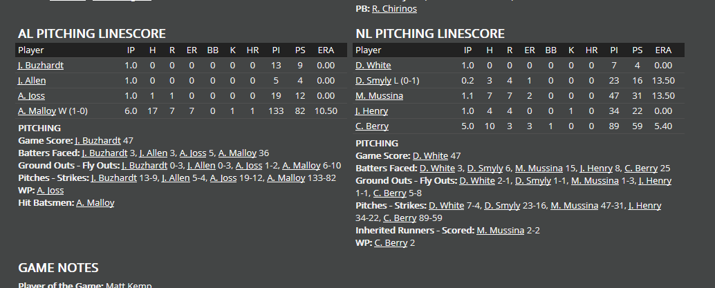 Even though the outcome doesnt matter, having the starting pitcher jus pitch 1 IP while perhaps the worst all star pitches 5-6 innings is terrible. In my EBL vs MLB league the ASG went 14 innings with the best 2 CL pitching 4 innings a piece. Ss is from a 1872 RD league.