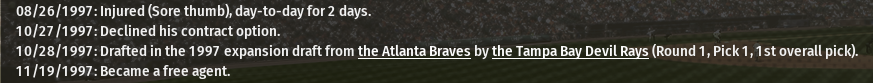 MLB Historical, it's the offseason after the 1997 season. On 10/27, P Burba informs me that he's opting out of the second and final year of his contract with my team and becoming a free agent. So for the expansion draft on 10/28, I obviously leave him off of my protected list. Burba gets drafted #1 overall to Tampa Bay. Three weeks later, he becomes a free agent - so essentially, Tampa Bay wasted their first pick. Burba ended up signing with St. Louis in January. Like I said, maybe this is how it works in the MLB and contract status was something that real teams had to keep an eye on - but as for a storyline, I'll pretend Burba took one look at Tropicana Field and said no way haha.
