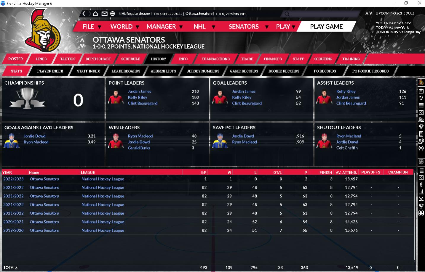 When setting up the new custom league, I changed - the league name to National Hockey League and abbreviation to NHL, - I believe I kept everything else the same on that screen (though can't be entirely 100% sure) - Draft & Rookie nationalities to Canada 34, USA 33, All Hockey Nations 33 - Ottawa Senators Fans to very loyal, Arena cap to 19,500 - rules - no change - Farm League - changed name and abbreviation to American Hockey League, AHL - changed Belleville (AHL) arena cap to 6257. Belleville fans level is now 'loyal' though that might be the default - Challenge mode - no - Manager screen - added my name, nationality Canada, 2nd nationality Finnish, cannot be fired - preferences, GM, coach ratings - unchanged. I looked at my Career Stats screen as GM/Head Coach and they're ok i.e. no duplication in stats. I hope this information helps you, and please inform me if you need any other info from me about this problem. |