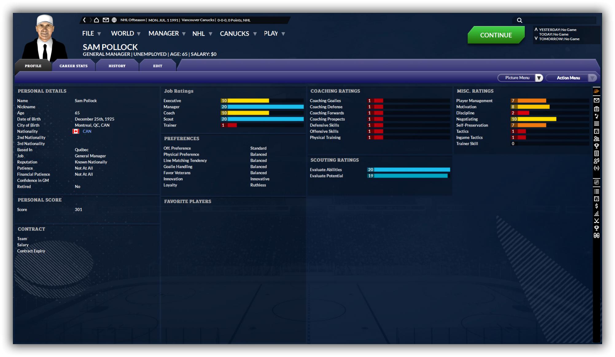 Somewhat surprisingly, we uncovered a number of good candidates, not the least of which is the gentleman pictured below. Born on Christmas Day, he'd be a wonderful gift as Head Scout for any team. *[House Rule: To make the game more challenging, we can only sign staff who had real life contracts with the Canucks].* We did manage to contact Sam via conference call, but despite a generous offer he declined to come out of retirement. Can't really blame him for wanting to spend more time with his family. |