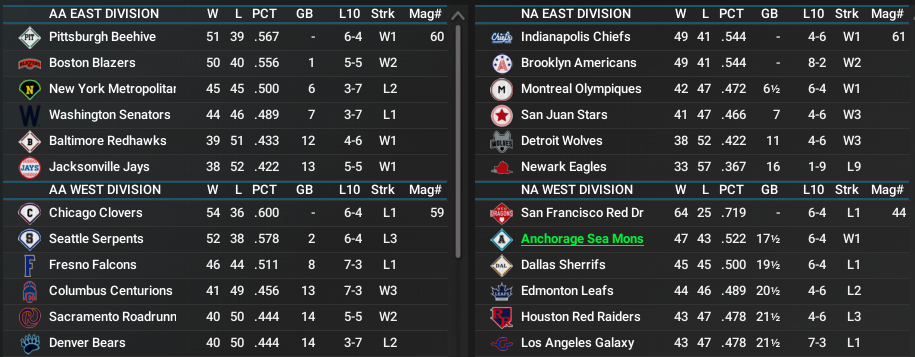 Currently, at the point of the draft, we are 47-43. That's good enough for 4th in the NA West out of 6 teams.