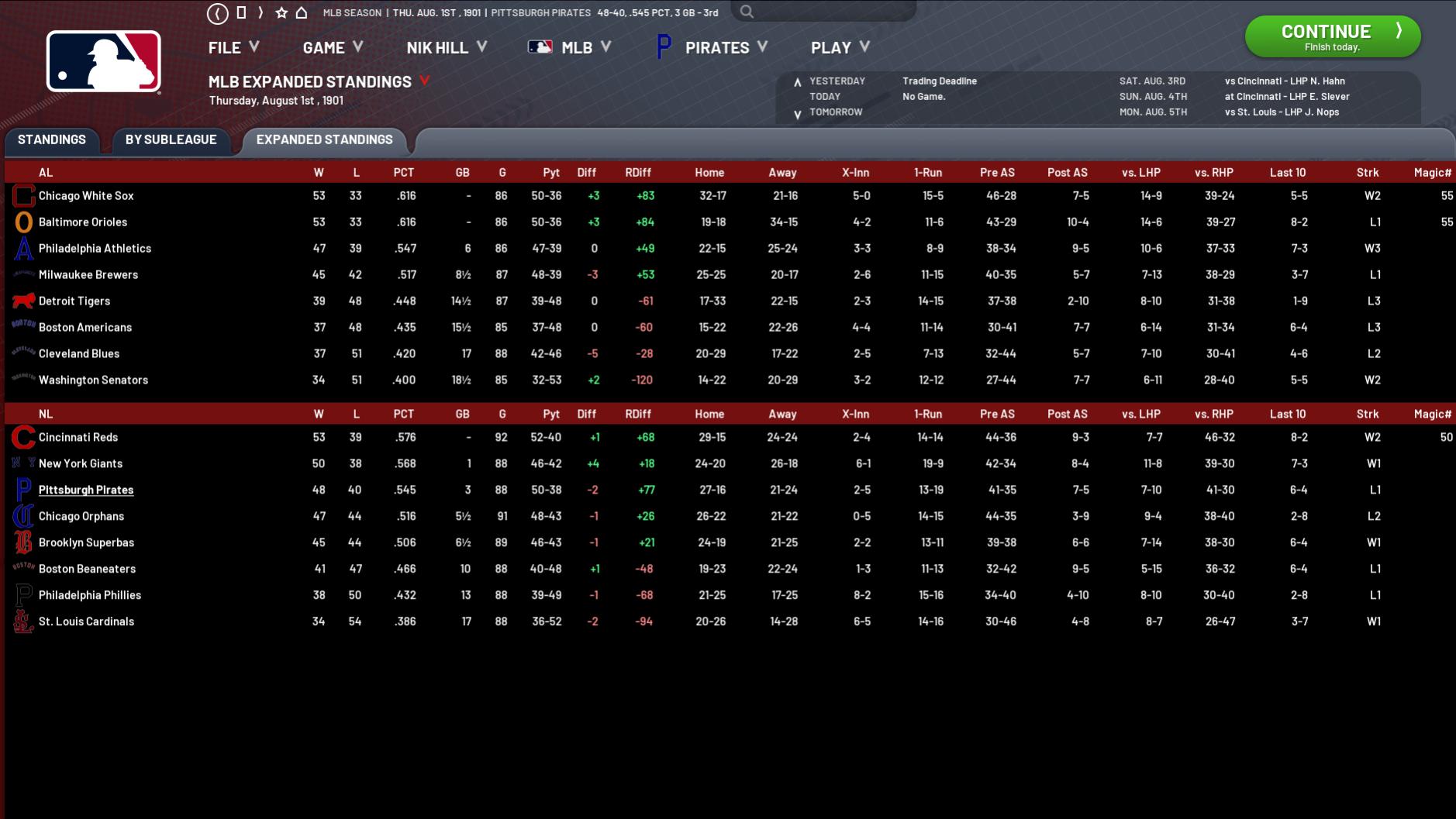 I’m keen to keep the majority of our playing group for the foreseeable future, and have gradually been locking them down over the course of the season so far. During the break, I sign Charlie Dexter to a $660 contract for 1902. More, perhaps, than he is worth on stats alone (Wagner, for instance, is on $750). But his flexibility means he is one of our most integral players. I needn’t have worried about rustiness, as we come out firing on all cylinders and win eight of our next ten games. We take sole possession of the lead for the first time on 08/15. A week after that, we’re five games clear, mainly by dint of the Jints dropping 7 straight (and counting) and the Reds going 3-7 for their past 10. We are still up by the same margin going into our last series of the month, a homestand with Chicago. Maybe the lads start getting ahead of themselves, maybe the Orphans make one big push to try and get back in contention, maybe baseball happens. I don’t know. Whatever the case, we play terribly, drop all three games, and virtually reattach ourselves to the peloton. Not an ideal end to an otherwise spectacular month. Hot