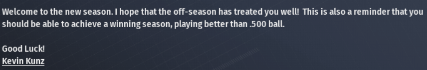 With the 1901 baseball season fast approaching, Boston Americans owner Kevin Kunz informed me that I need to achieve a winning season this year. Additionally, I need to improve my right fielder by 1902 (I guess he doesn't like Win Mercer), and make the playoffs by 1903. Will see how this goes.