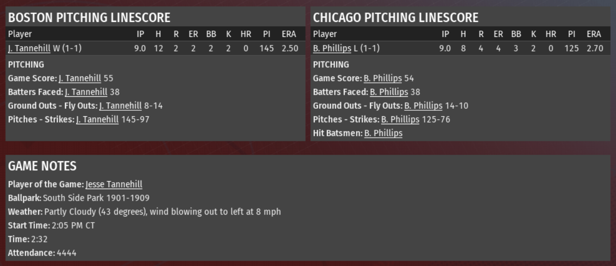 Watch Out, Boston is on a roll! The Americans topped the White Sox by a 4 to 2 score for their 4th consecutive win. Although he allowed 14 base runners (12 hits and 2 walks), Jesse Tannehill (1-1) limited the damage to 2 ER to pick up the complete game win. At the plate, Boston was led by Dave Brain (2 for 4, 1 rbi) and Frank Chance (2 for 4, 1 run).