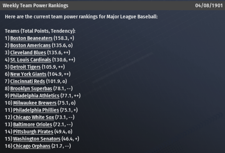 The first week of the 1901 season is finished and the Boston Americans are off to a nice start. With a 5-2 record, Boston is currently tied with the Cleveland Blues for top spot in the American League. Leading the way in the National League standings, and the top overall power ranking, are the Boston Beaneaters whose 6-1 record is tops in baseball.