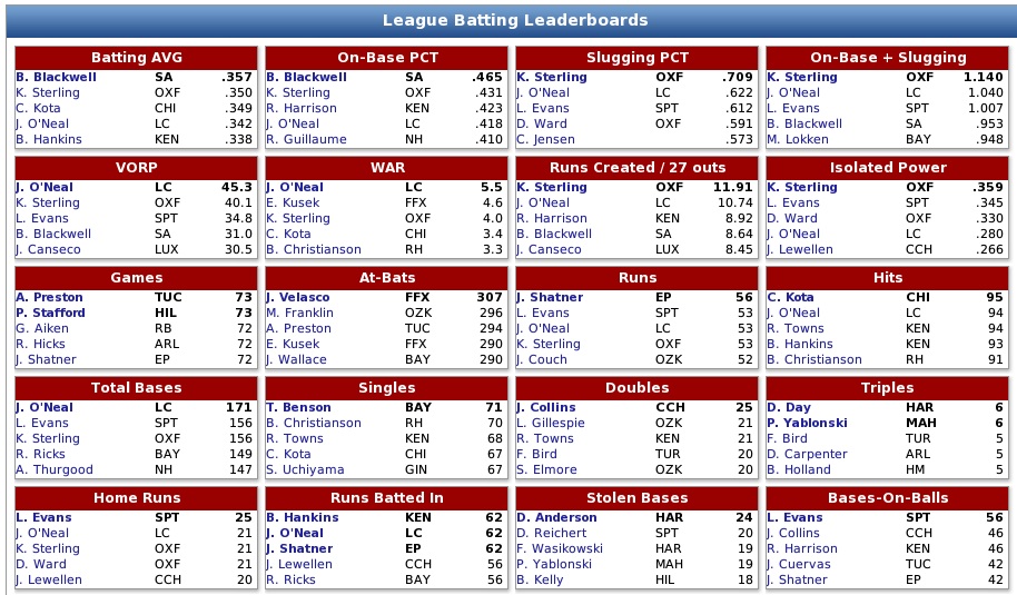 While the Tycobbian Union best will be these stars: SP Dixie Brooks (EP) (10-4/1.88) SP Duke Mahoney (HIL) (11-5/1.97) SP Johnny Petrie (OXF) (12-4/2.43) SP Pat Kovacs (LC) (10-5/1.77) SP Freddi Rossi (SUM) (10-6/2.28) SP Ko Yuma (MDW) (10-3/2.31) SP Cary Snead (MDW) (10-4/2.68) SP Ken Lawson (ARL) (11-3/2.72) SP Maury Cantrell (RH) (9-5/2.25) MR Don Sawyer (BSC) (1-0/1.76) C Davy Reichert (SPT) (.297/9/39/47) (.985 FA/4 PB/25.4% RTO) C John Fitzpatrick (OXF) (.303/1/20/39) (.993 FA/4 PB/35% RTO) C Paco Diaz (ARL) (.299/2/19/37) (.988 FA/0 PB/32.8% RTO) 1B Kerry Sterling (OXF) (.354/21/44/52) (.992 FA) 1B Mandu Purula (SUM) (.340/10/50/34) (.992 FA) 1B Philip Stafford (HIL) (.293/14/50/44) (.998 FA) 2B Jan Kessinger (KEN) (.306/1/23/30) (.984 FA) 2B Julio Canseco (LUX) (.324/10/36/37) (.977 FA) 3B Billy Christianson (RH) (.327/7/39/34) (.969 FA) 3B Rodney Harrison (KEN) (.298/8/35/47) (.911 FA) SS Jarred O'Neal (LC) (.338/20/60/52) (.957 FA) SS James Couch (OZK) (.282/12/48/52/ (.961 FA) LF Roy Ricks (BAY) (.292/16/53/46) (.986 FA) LF Charley Kota (CHI) (.345/6/30/41) (1.000 FA) CF Jim Lewellen (CCH) (.258/20/55/51) (.994 FA) CF Dalton Ward (OXF) (.265/21/53/42) (.964 FA) RF Babe Hankins (KEN) (.336/10/60/38) (1.000 FA) RF Lorne Evans (SPT) (.273/25/54/51) (.958 FA) RF Ike Sweetwater (RB) (.297/11/44/41) (.992 FA) |