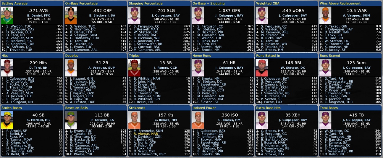Antonio Vasquez of Summerland collected 51 doubles this year, but it is far short of the IPA record of 59 set in 2029 by Ronnie Guillaume of North Hills. Slugging Jerry Culpepper of the Bayview Vikings had another spectacular season with 61 homers, but it was 5 short of his all-time IPA record set last year with 66... Culpepper is tied for fourth place with High Mesa's Jack Elliott, who also racked up 61 in 2013... Culpepper ranks third all-time with 63, hit in 2039... number two is Elliott with 65 in 2021. Last edited by Eugene Church; 11-22-2013 at 09:15 PM. |