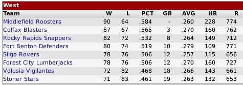 Tuesday, September 17, 2041 STALLIONS RACE BY RED SOX IN LATE SURGE In the Tycobbian East Division the South Fork Stallions and Red Bluff Red Sox ran neck-and-neck until August when the Stallions raced by them to handily win the pennant... the Red Sox faded to third place, losing out by 10 games... defending division champ Ozarka also slipped by them and wound up in second place, nine games behind South Fork. 1. South Fork (87-67): the Stallions snapped a five-year run in the second division of the TU East, all of them under the .500 mark... they pulled up from fifth place last season (6 GB)... the last time South Fork was in the playoffs was the Pro-Cup winning season in 2025... that is their only IPA title... pretty good pitching (3.49 ERA-6th), pretty fair offense (.260 BA-17th) and solid defense (.975 FA) brought home the pennant this year... not expected to be much of a factor in the Pro Cup competition... experts are not impress with pitching, nor batting. Top Pitchers: Jay Murphy (22-8/2.86) and Mike Lambertini (15-11/3.40) gave them two quality pitchers... Big Murph McAlister (12-19/3.37) was effective, too, but didn't have good run support. Top Batters: 1B Paul Sexton (.267/39/109/94) was the club leader in homers, RBIs and runs scored... steady 3B Elton Jacoby (.297/22/82/92) enjoyed another good season... as did SS Jess Wilkerson (.306/18/56/90). 2. Ozarka (78-76) (9 GB): for the fifth time in eight seasons the Naturals finished in the runner-up spot... their downfall was a very poor 4.49 ERA (28th)... they were fine offensively with a .272 BA (6th), 767 runs (6th-tied) and 165 HRs (14th-tied)... defensively the Nats were average with a .974 FA... in 15 playoff appearances Ozarka has never won a Pro Cup, but has come close five times, when they were beaten in the Finals ('11, '12, '16, '19, '20). Top Pitchers: Glen Jenkins (18-14/3.54) was the only effective starter... the best in the bullpen was two rookie relievers Gene White (5-0/2.83/3 saves) and Jim Greene (8-4/3.13/16 saves). Top Batters: All-Star SS Duffy Morrison (.307/25/104/96), LF Lonnie Gillespie (.311/13/73/90), 3B Jimmy Woods (.298/19/88/88), CF Reggie Davidson (.263/29/76/112), All-Star C Jaak Pajukivi (.299/21/74/78). 3. Red Bluff (77-77) (10 GB): the Red Sox rose up from fifth to third this season based mainly on improvement on the hill from 4.38 ERA down to 3.62 ERA (8th) and longball power with 226 HRs (2nd)... only two teams in the IPA had more... Bayview of the TU West led the IPA with 241... number two was Middlefield with 228 in the Ruthlandian Union... the Red Sox haven't participated in the Pro Cup playoffs since 2009, but they did win the Pro Cup in 2004. Top Pitchers: 24-year-old Mickey Rosen (22-8/3.33) came out of nowhere to become the club's ace in his third season... not a lot after him except for George Reynolds (12-24/3.33), who had 20 complete games and 22 quality starts. Top Batters: nobody hit much for average, but they did go deep... All-Star CF Ike Sweetwater (.263) led with 48 homers, 112 RBIs and 114 runs, RF David Kelso (.255) had 44 homers, 102 RBIs and 81 runs... 3B Fran Blanchard (.275) hit 34 HRs with 94 RBIs and 79 runs... SS Leemon O'Donovan (.274) had 29 roundtrippers, 84 RBIs and 69 runs and LF Jesse Shaw (.265) with 23 HRs, 80 RBIs and 84 runs. 4. Tuckanarra (73-81) (14 GB): the Tucks posted their worst season in two decades... they are one of the perennial powers in the IPA with 13 pennants and three Pro Cups ('23, '24, '35)... the Blue Jays had so-so offense with a .255 BA (21st), 688 runs (22nd-tied), 117 HRs (28th) and so-so pitching with a 3.95 ERA (19th)... and average defense with a .971 FA. Top Pitchers: All-Star and ace Junior Bristow (20-13/2.88) racked up 20 wins for the seventh time in his eight seasons... Jeff Buttrum (18-16/4.10) was inconsistent and had a sub-par year. Top Batters: only two had good seasons... LF Spade Weldon hit .356 with 16 HRs, 68 RBIs and 82 runs and superstar RF Lorne Evans rapped 33 homers, drove in 101 runs, scored 96 runs and walked 108 times... Evans, a shoo-in for the IPA Hall of Fame, is 36 years old... he has 660 HRs, 1705 RBIs, 1931 runs and a career .306 BA... Evans is fourth on the all-time IPA home-run leaderboard. 5. Hillsboro (71-83) (16th): for the eighth year in a row the Blazers are stuck in the TU East second division... tied for fifth with High Mesa... they have zilch pennants and no Pro Cups... one of the worst franchises in the IPA... terrible offense but fairly good pitching... .238 BA (30th) with a 3.69 ERA (10th)... really bad defense with a .967 FA. Top Pitchers: starters are credible with Jamie Lee Bradley (14-14/3.02), Lee Dixon (13-18/3.38) and Steve Cooper (14-15/3.97), but got little run support. Top Batters: LF Julien Bellini led the team with 27 HRs, 78 RBIs, 92 runs and 37 SBs, but batted a lowly .226... SS Scotty McNeill had the best average with .295, 7 HRs, 43 RBIs and 86 runs... 3B Paul Butler added a .266 BA with 16 HRs, 77 RBIs and 76 runs. 5. High Mesa (71-83) (16 GB): after almost winning the pennant last year, the Cowboys dropped back tied for fifth... no postseason for 38 years... but they made the playoffs their first two seasons in the IPA and even won the Pro Cup in 2002... nothing but failure since... the Cowpokes have a lousy offense with a .237 BA (31st) and mediocrity on the mound with a 4.17 ERA (23rd)... average with the gloves (.973 FA)... however, High Mesa hits homers... 216 this season, ranking third in the Tycobbian Union and fifth in the IPA. Top Pitchers: Dean Harris (18-12/2.67) and Emil Novak (14-11/3.79) pretty much carry the team... Harris, age 36, has never played for a good team, but has posted a 214-226 record with an impressive 3.03 ERA in 15 seasons. Top Batters: 39-year-old veteran RF Corbett Brooks hit 55 HRs, a career-high, but batted only .238 with 99 RBIs and 94 runs... he now ranks fifth on the all-time home-run list with 651... only HOF-ers Jack Elliott (848), Phil Gra