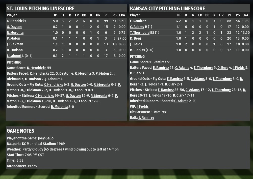 St. Louis' Andrew Benintendi hit a two-run home run off Kansas City's Josh Fields with two outs in the bottom of the eighth inning to lift the River Walkers to a 2-1 win over the Pit Masters at Kansas City Municipal Stadium. With the win, St. Louis took the final two games of the three game series. The game's only other run came in the bottom of the first, when an Eric Thames sacrifice fly off Walkers starting pitcher Aaron Nola scored Allen Cordoba. Nola would not allow a run over the next six innings. Overall, he allowed five hits while striking out eight and walking one. Masters starter Dinelson Lamet was impressive as well, tossing five shutout innings. He gave up just three hits, with six strike outs and two walks. |