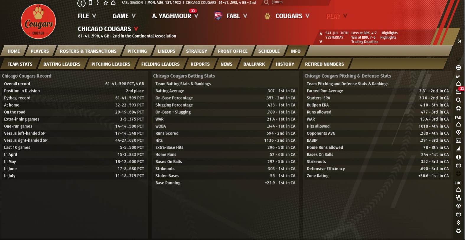 Chicago Cougars (61-42): 3 Brooklyn Kings (48-58): 14 W: Tom Barrell (2-0) L: Tommy Wilcox (1-1) Should I ask for a refund? The Kings absolutely shelled former King Tommy Wilcox and Tom Barrell looked really good against us. Wilcox went 6.2 innings and allowed 10 with 13 hits, 10 runs (7 earned), and just one strikeout. Gus Cain had a rough outing (likely last), 3 hits and 4 runs with a walk and 2 strikeouts in 1.1 innings pitched. Cy Bryant was 2-for-2 with a walk, sac-fly, and run scored. Arnold Bower was 2-for-5 with an RBI. Harry Simmons was 1-for-3 with a run, double, and RBI. Mike Taylor was 2-for-3 with a walk. August 2nd, 1932 Chicago Cougars (61-43): 3 Brooklyn Kings (49-58): 4 W: Mike Murphy (1-0) L: Len Moore (1-2) This does not bode well for the Stars series... Tied at four, rookie Elmer Nolde homered off Len Moore and the Kings walked off and took three of four in a series we really needed to win. Best part? Errors killed us in this one. Max Wilder did look shaky, 11 hits and 4 runs (1 earned...) with 2 walks and 4 strikeouts in 8 innings. Moore only threw one pitch, only the homer to Nolde. Cy Bryant was 3-for-4 with 2 triples and 3 RBI's. Russ Combs was 3-for-5. Bill Ashbaugh was 2-for-3 with a walk, RBI, and three runs scored. Mike Taylor was 1-for-4 with a triple and run scored. Arnold Bower and Vince York were both 2-for-5. August 2nd, 1932 Chicago Cougars (62-43): 4 New York Stars (68-39): 3 W: Dick Lyons (13-5) L: Lour Martino (10-4) SV: Steve Castellini (1) We entered the series with the Stars six (!) games out of first place and we really needed to win this game. We tried so hard to blow this one, but held on to win 4-3. We have to keep playing against Lou Martino, who's now 0-3 against us and 10-1 against the rest of the league. Dick Lyons was excellent, 8 innings with 6 hits, 2 runs, and 3 strikeouts. Castellini allowed a hit, run, and walk, but picked up the save. Vince York was 1-for-3 with a double, walk, and two runs driven in. Bill Ashbaugh was 1-for-3 with a triple and walk. John Kincaid was 1-for-4 with a run scored. Mike Smith had a huge pinch hit solo homer in the 9th, giving us at the time a 4-2 lead. August 3rd, 1932 Chicago Cougars (62-44): 3 New York Stars (69-39): 4 W: Boyd Harper (11-7) L: Steve Castellini (6-4) The Stars flipped the script, and this time topped us 4-3. To make things worse, we were up 3-1 heading to the ninth and Castellini imploded. He allowed 3 hits, a walk, and 3 runs, including a walk-off base clearing triple from Gordie Loftus. It ruined a dazzling Dick Leudtke start, 8 strong innings with 5 hits, a run, 5 walks, and 2 strikeouts. He was also 1-for-3 with an RBI. John Kincaid was 3-for-4 with a run scored and a homer away from the cycle. Bill Ashbaugh was 1-for-4 with a solo homer. Cy Bryant was 1-for-3 with a sac-fly and run scored. August 4th, 1932 Chicago Cougars (63-44): 4 New York Stars (69-40): 2 W: Jim Crawford (12-8) L: Gene Stevens (9-5) SV: Steve Castellini (2) Four seems to be the magic number, and we at least won't lose another series as we secured a split with a 4-2 win. Jim Crawford looked good, going 6.2 innings with 6 hits, 2 runs, 3 walks, and 3 strikeouts. Steve Castellini picked up the save, 2.2 innings with 2 hits and a walk. Arnold Bower was 2-for-4 with a triple, walk, run, and 2 RBI's. Mike Taylor was 2-for-5 with a double and run scored. Vince York was 2-for-4 with an RBI. Tom Taylor was 2-for-5 with an RBI. Bill Ashbaugh was 1-for-3 with 2 walks. August 5th, 1932 Chicago Cougars (64-44): 11 New York Stars (69-41): 5 W: Tommy Wilcox (2-1) L: Randy Johnson (3-3) So we can't beat the Kings, but we take three of four from the Stars? We won the finale in commanding fashion, 11-5 and we finally looked like a real team again. Mike Taylor was 2-for-4 with a homer, walk, 3 runs, and 3 RBI's. Bill Ashbaugh was 2-for-5 with a solo homer and two runs scored. Tom Taylor was 1-for-5 with a two run homer. John Kincaid was 1-for-4 with a double, walk, and two runs scored. Tom Taylor was 1-for-5 with a two run homer. Cy Bryant was 1-for-4 with a double, walk, and 3 runs driven in. Starter Tommy Wilcox was 2-for-4 with a run and 2 RBI's. He still didn't look good on the mound, going nine with 12 hits, 5 runs (3 earned), 2 walks, and 4 strikeouts. August 6th, 1932 Chicago Cougars (65-44): 2 Montreal Saints (49-62): 1 W: Max Wilder (9-6) L: Dave Paynter (11-10) The offense disappeared in the opener against the Saints, but we broke a 1-1 tie in the 9th to take the opener 2-1. It's not all good, as the fragile Russ Combs is hurt again, this time for two weeks with a Latissimus dorsi strain. Before getting hurt, he was 2-for-5 with a double, run, and RBI. Max Wilder was dominant, going all nine with 6 hits, a run, 3 walks, and 3 strikeouts. He was also 1-for-4 with a run and walk. Arnold Bower was 3-for-5 with a double. Cy Bryant was 2-for-4. Stars of the Week Bill Ashbaugh : 22 AB, 8 H, 3 HR, 3 RBI, .364 AVG, 1.416 OPS Cy Bryant : 24 AB, 9 H, 0 HR, 8 RBI, .375 AVG, .997 OPS Arnold Bower : 33 AB, 11 H, 0 HR, 4 RBI, .333 AVG, .777 OPS Weekly Summary A winning week! I forgot what this feels like! It's just 4-3, but we made up half a game on the Stars (69-41). We have three more with the Saints before one in Philly (57-53) and three in Toronto (34-76) before an off day. We need a huge week as we cannot afford to drop more then two games this week. We'll have to do it without Russ Combs, however, and while he's really struggled lately, it's still a big loss. He's hitting .344/.389/.479 (118 OPS+) with 3 homers, 11 steals, and 30 RBI's in 285 trips to the plate. July was rough for him like it was for most of our guys, as he hit just .237/.290/.278 with just 1 steal and 11 RBI's. The acquisition of Arnold Bower is huge right now, as him and Harry Simmons will handle middle infield duties. The 28-year-old Bower is hitting .367/.407/.512 (131 OPS+) with 2 homers, 3 steals, and 32 RBI's since the trade. Simmons isn't nearly as good t