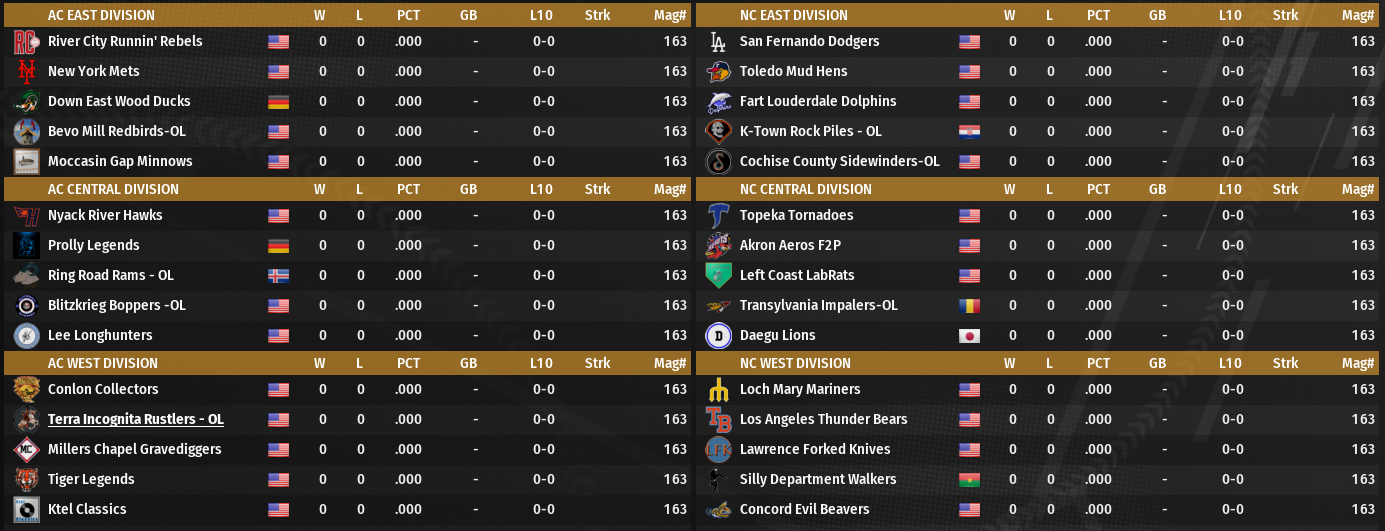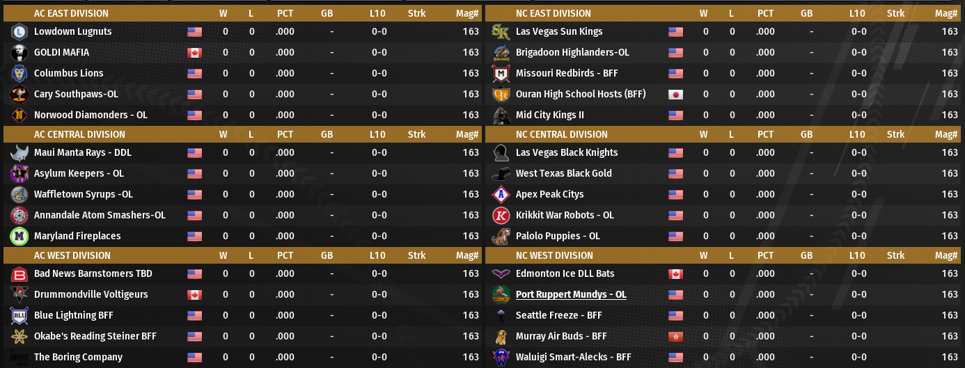 I have 8 teams here. Six are in the AC and two in the NC. At least the two in the NC are in the same division. Missing Hooterville, Brooklyn and Hartford