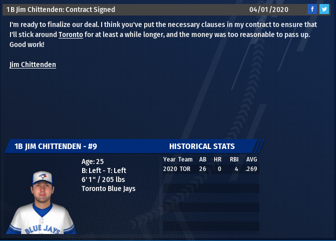 1b Jim Chittenden agreed to an 8 year extension. Rp Eddie Fisher will miss the rest of the season. RP Christian Naylor will replace him on the roster.