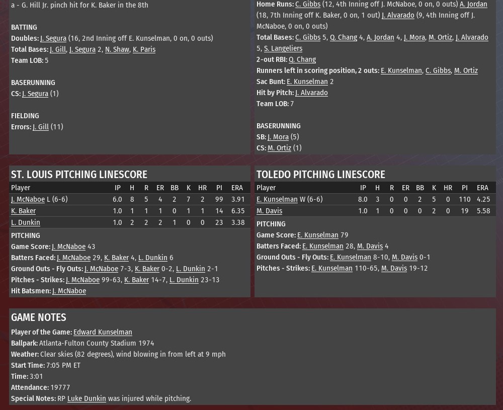 Edward Kunselman pitched eight shutout innings and Mike Davis handled the ninth, as Toledo shut out St. Louis 8-0 at Atlanta-Fulton County Stadium (1974). Kunselman (6-6) allowed just three hits (two singles and a double) over his eight innings. He struck out five and walked two. He was lifted after throwing 110 pitches. Davis allowed a two-out single to Nick Shaw in the ninth, but nothing else as the Mud Hens took their third straight game from the River Walkers with one game left in the series. Toledo broke open a scoreless games with back-to-back home runs from Chris Gibbs and Jorge Alvarado off St. Louis starter Jesse McNaboe to open the bottom of the third inning. A pair of walks in that inning led to a third run, Quiang Chang driving it in with a two-out single. The Mud Hens added two more runs in the fifth. They put four straight hitters on open the inning with three singles and an error by third baseman Jovan Gill. Jorge Alvarado had an RBI single in that mix. Andy Jordan spanked a solo homer off reliever Kevin Baker in the seventh, upping the Hens advantage to 6-0. Chang collected his second RBI of the game in the eighth by driving in one of that inning's two runs with a double off Luke Dunkin. |