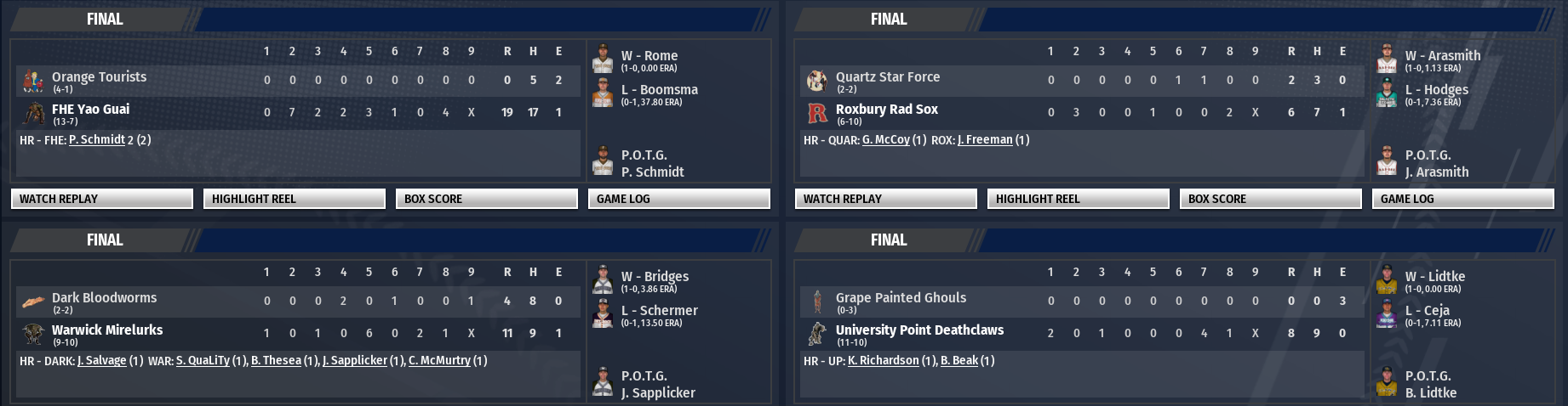 Today in the CBO News and Notes - Reports from around the Commonwealth by Nat Wright-Kawolski 7 March 2300 UP Throws 4th Starter, 4th Starter Throws No-No For the second time in three days, a CBO pitcher has thrown a no-hitter in the 2300 Nuka Cup Tournament. The first time, it was perhaps the #1 starter in all of baseball. This time? It was perhaps the 96th-best. University Point Deathclaws starter Bobby Lidtke, battling to be his team's 4th starter, threw a no-hitter in an elimination game, with the Deathclws defeating the Grape Painted Ghouls, 8-0. Lidtke walked five and struck out 10 in the game, by far his best start in either his CBO or BMU appearances. Kory Richardson was 2 for 4 with a home run, two runs, and an RBI. Blue Beak hit a pinch-hit home run in the 8th. Day 5 scores and this game's boxscore below.