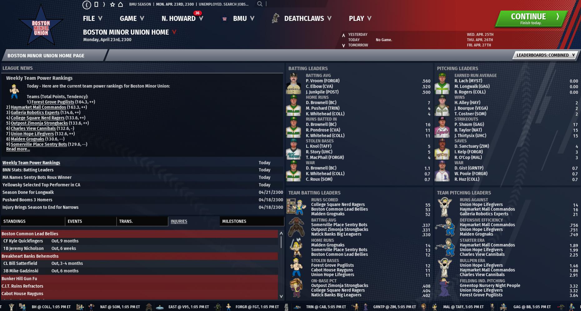 BNN Weekly Report This Week in the CBO by Nat Wright-Kawolski 30 April 2300 News Around the League 26 April 2300 - Huz Tosses 6-0 Shutout Fans at Nuka Cola Square witnessed the College Square Nerd Ragers blank the Bunker Hill Gun Fu, 6-0 behind a superb effort by starter Ryan Huz. The College Square right-hander allowed 2 hits in recording the shutout. "Ryan was good today but I don't want to focus too much on a single game," College Square manager Deadball Jenkins said later. "If you're capable of playing at this level, you're capable of having a good game. The real question is if you can learn from that game and repeat it." Players of the Week Aguilar Picked CA Player of the Week So far in his young career, Carlos Aguilar has kept a low profile, but after his performance at the plate last week, he attracted the notice of the rest of the Commonwealth Association in a big way as he was named the Player of the Week today for his efforts. The 20-year-old College Square Nerd Ragers third baseman hit at a torrid .538 clip as he collected 7 hits in 13 at-bats, 3 home runs, 7 RBIs and 6 runs scored. Johnny Tattooman Captures MA Award His hard work and hustle paid off this week. The hard-working and hard-playing Johnny Tattooman was rewarded with the Massachusetts Association Player of the Week honors. The scrappy Fiddler's Green T-60s third baseman hit .563 while collecting 9 hits in 16 at-bats, 2 home runs and 7 RBIs. Prospect Spotlight #18 - LF Michaelangelo Sandifer, Somervile Place Sentry Bots (Egret) - 14/38 (.368), 2 HR, 10 R, 7 RBI, 9 BB, 8 SO Analysis: Egret's former 2nd-round pick has been progressing nicely and looks like he'll be a good addition to the outfield lineup in time. He has been a good defensive corner outfielder from the start, but now his bat is starting to come around, currently holding a .490 OBP. As of last season, scouts started noticing changes in his approach to the plate with a lot more contact than he had in past seasons. While he does hit too many balls right at the shortstop or left fielder, he had been finding the gap up the middle more as of late, leading to a fast start in 2300. #19 - SP Aimer Doghair, Malden Grognaks (County Crossing) - 3 GS, 1-1, 3.78, 16.2 IP, 15 HA, 7 ER, 4 BB, 10 K Analysis: The 2298 2nd-round pick for County Crossing struggled in his rookie campaign, going 3-10 with an 8.54 ERA in 18 starts, but he has turned that around so far in 2300. His curveball is coming around to be his dominant pitch over his mid-90s fastball. He is a focused player, so he only looks to improve in the future barring injury. #20 - SP Jason Bourque, Corvega Flamers (Sunshine Tidings) - 3 GS, 3-0, 1.33, 20.1 IP, 22 HA, 3 ER, 7 BB, 13 K Analysis: Originally taken in the 2nd round of the 2297 Rookie Draft by The Slog, Sunshine Tidings' Bourque is looking more and more like he will be ready for the CBO soon. He needs to work more on his control to walk fewer batters, but he has had success ever since being traded to the Chemists organization with no higher than a 3.77 ERA in the BMU. His first three starts have all been plus starts this season, and if his slider gets any more deadly, he'll be striking out a ton of CBO batters soon. # 21 - 1B Chase Doctorman, Vault 95 Robobrains (Vault 81) - 17/41 (.415), 2 2B, 2 HR, 6 R, 9 RBI, 7 BB, 4 SO Analysis: The 5th overall pick of the 2298 Rookie Draft, Doctorman has improved over a solid rookie campaign, showing he may get the call up to the Dwellers before he knows it. That would mean Jason Robinson, who is doing well for the CBO club would be expendable, but Doctorman looks to be a plus talent they need. Currently with a .415/.500/.610 line, Doctorman has been crushing the ball so far in the 2300 season. His extra-base hits have not come in bunches just yet, but he did have 26 in 75 games last season. That number will probably go up in 2300, assuming he does not get the call up. # 28 - CF Any Why, Easlake Aquaboys (FHE) - 8/40 (.200), HR, 6 R, 3 RBI, 6 BB, 13 SO, 4 SB, 2 CS Analysis: While the other five prospects ranked in the late-teens to 20s are doing well, Why has struggled so far in 2300. Considered a good all-around player with no outstanding skills, Why should develop into a decently good outfielder in the CBO. But first he needs to find his bat. The former 17th overall pick in the 2297 Rookie Draft, Why showed marked improvement with the Aquaboys last season. That should give the Yao Guai franchise hope that he will be ready if he needs to be called up due to injury. Even with only a .200/.304/.275 line right now, those numbers should start crawling up soon. He has certainly been unlucky with finding the gaps so far, but he should improve on his 38 extra-base hits in 2299. Weekly Team Power Rankings Weekly Team Power Rankings: Here are the current team power rankings for Boston Minor Union: Teams (Total Points, Tendency): 1) Haymarket Mall Commandos (179.6, +) 2) Galleria Robotics Experts (139.9, +) 3) Fiddler's Green T-60s (138.9, ++) 4) College Square Nerd Ragers (135.9, o) 5) Boston Common Lead Bellies (117.5, ++) 6) Somerville Place Sentry Bots (117.5, ++) 7) Union Hope Lifegivers (117.5, o) 8) Outpost Zimonja Strongbacks (115.5, --) 9) Cabot House Rayguns (102.2, ++) 10) Charles View Cannibals (99.2, --) 11) Greentop Nursery Night People (99.2, -) 12) Malden Grognaks (99.2, --) 13) Forest Grove Pugilists (94.2, --) 14) Taffington Boathouse Spy Hunters (82.8, ++) 15) C.I.T. Ruins Refractors (80.8, o) 16) Natick Banks Big Leaguers (80.8, -) 17) Corvega Flamers (78.8, ++) 18) Mystic Pines Raybathers (46.1, ++) 19) Vault 95 Robobrains (46.1, ++) 20) Bunker Hill Gun Fu (44.1, --) 21) Eastlake Aquaboys (44.1, ++) 22) Trinity Plaza Snipers (41.1, --) 23) Breakheart Banks Behemoths (40.1, --) 24) Postal Square Action Boys (22.7, --) Stats and Standings