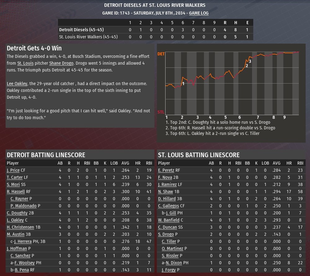 Making his first start of the season since coming off the injured list, Jeff Hoffman pitched 3.1 scoreless innings and a trio of relievers did the rest as Detroit shut out St. Louis 4-0 at Busch Stadium (2006). Hoffman, who suffered a rotator cuff injury late in spring training, allowed three hits in his time on the mound. He struck out two and didn't issue a walk. After that, it was Cristian Sanchez (7-0) who earned his seventh victory of the season with 2.2 innings of shutout ball. The final three innings were handled by Clyde Rayner (2.0 IP) and Pablo Maldonaldo (1.0), as the Diesels limited the River Walkers to five hits overall. A solo homer from Cade Doughty off St. Louis starting pitcher Shane Drogo to lead off the top of the second inning provided the Diesels with the only run they would need. Drogo was making his first start in the majors since May 10 when he suffered a hamstring injury. He also made a number of rehab starts at AAA Memphis. Detroit broke the game open in the with three runs in the sixth. Robert Hassell chased Drogo with a run-scoring double. Lee Oakley had a two-run single off reliever Cory Tiller. |