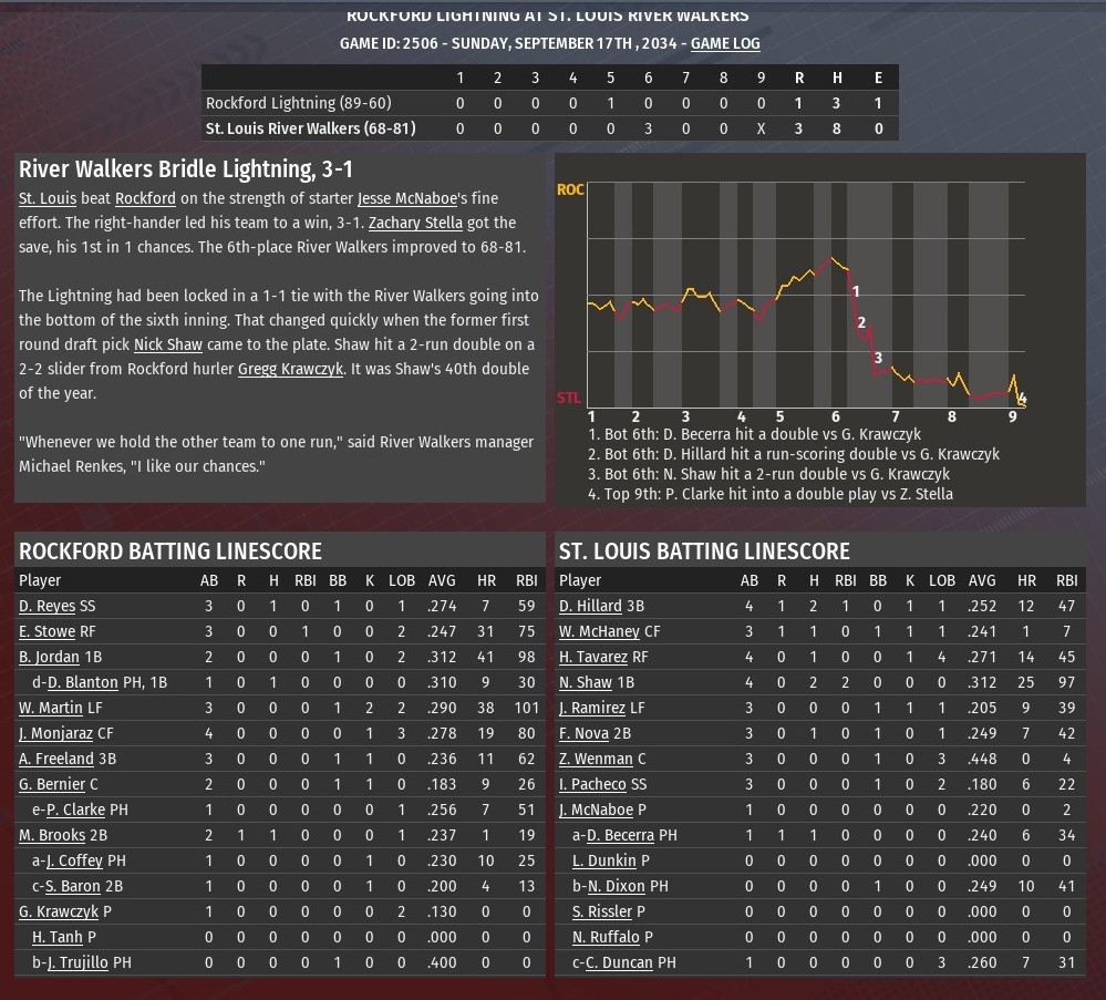 Jim Martin allowed two runs on five hits over the opening 5.1 innings, and that was enough to help St. Louis defeat Evansville 4-2 at Yankee Stadium (1968). Tied 1-1, the River Walkers actually took the lead for good in the top of the third inning against Bosses starting pitching Sam Stoutenborough. Nathaniel Dixon tripled with one out and scored on a fly ball by Bob Saavedra, as the rookie collected his first RBI at the major league level. St. Louis increased its lead to 3-1 in the fourth, Nick Shaw hitting his 26th homer of the season, this one off Stoutenborough, while also collecting his 100th RBI of the season. The Bosses' Jeff Waldron had an RBI single off Martin in the fourth, making it 3-2. The Walkers completed the scoring in the fifth. It all happened with two outs after reliever Matthew Liberatore entered the game. Hector Tavarez greeted him with a single. Tavarez stole second, and scored when Evansville shortstop Brian Vargo misplayed a ball hit by Shaw. Martin (11-11) allowed two runs on five hits in 5.1 innings. He struck out four and walked two. Scott Rissler worked out of a jam in the sixth, recording to outs and keeping the score 4-2. Rookie Greg Sones retired all six batters he faced in the seventh and eighth. Zachary Stella pitched a perfect ninth for his second save. Last edited by rink23; 08-18-2021 at 04:45 AM. |