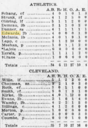 Chickazoola has brought to my attention that the Edwards that is listed on Baseball Reference and is pictured below in the Facepack is not the player that actually played on September 17, 1915 for the Philadelphia A's. The Philadelphia Evening Public Ledger of that date states that the player was likely playing under a pseudonym and was from Chicago. They also thought he was a collegiate player. None of that fits the profile of a "Ralph Edwards" who is listed as 32 years old during that game.