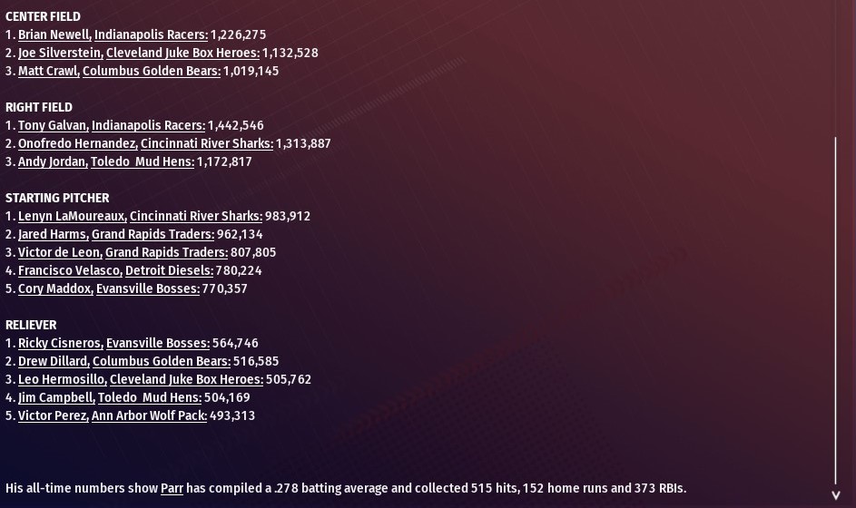Former River Walker pitcher Jim Martin shut out St. Louis over 8.1 innings and the Madison bullpen finished the job, as the Muskies won 7-0 at Busch Stadium (2006). Martin (6-2), who spent the 2034 and part the 2035 seasons before being traded to Louisville, allowed four hits (three singles and a double) in his 8.1 innings on the mound. He struck out four and walked two. Martin exited the game after giving up a one-out single to Jackson Miller in the bottom of the ninth. Robert Chacon took over and recorded a pair of fly outs to end it. The Muskies jumped on St. Louis starting pitcher Xavier Wigfall for a run in the first. It came via back-to-back one-out doubles from Brady House and Tyler Hamilton. Madison added two more runs off Wigfall in the fifth. Hamilton and former Walker Dan Hillard plated the runs with RBI singles. Adam Macklin smacked a solo homer off Wigfall in the sixth as the lead reached 4-0. The rest of the damage came against the Walkers bullpen. Brett McVey gave up a run in the eighth. Mark Holland tripled with one out and scored on a Kevin Militello single. Armando Cintron surrendered two runs in the ninth. Holland had an RBI single. Militello plated the game's final run with a double. |