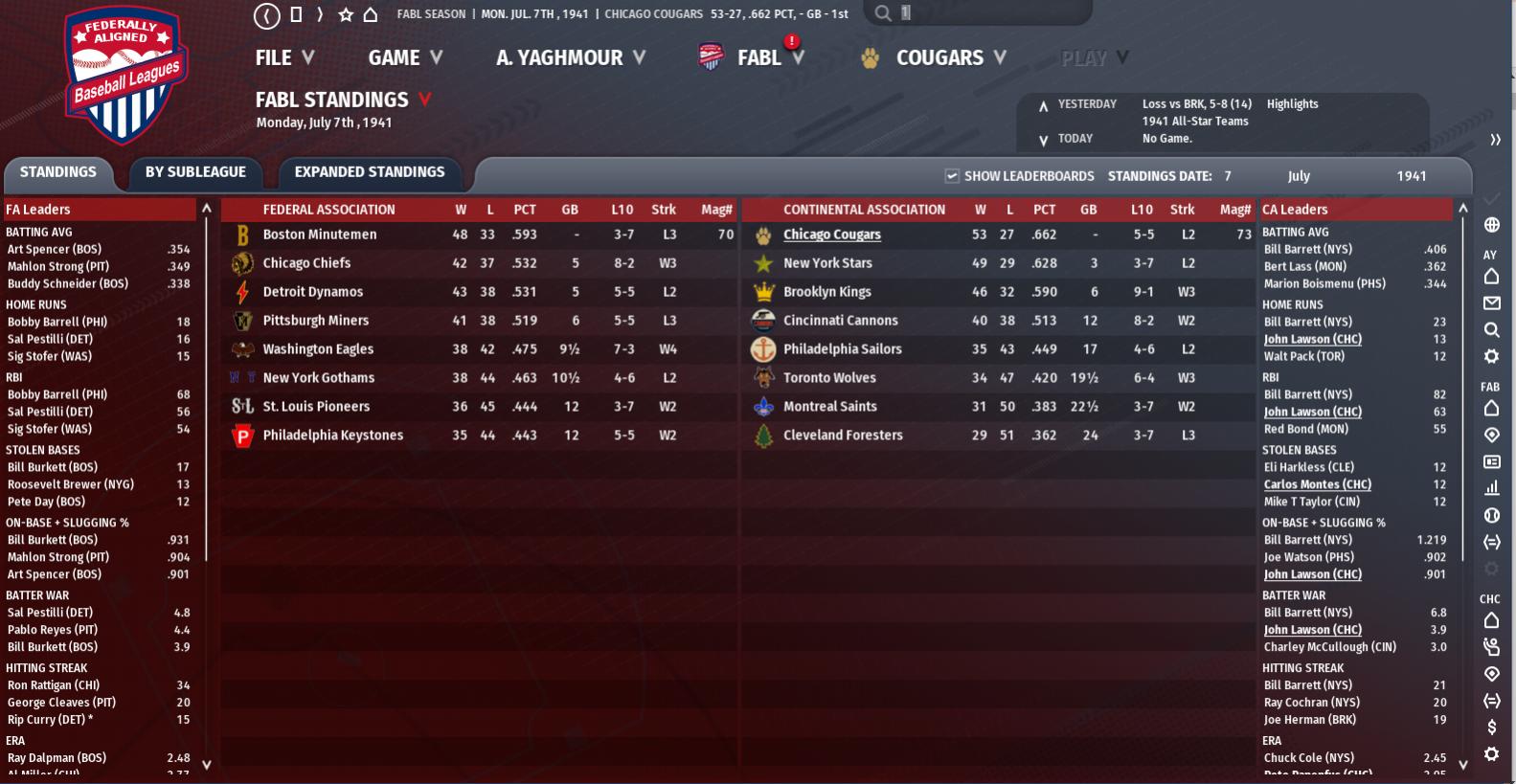 Seasonal Record: 83-45 (1st, 7.5 GA) Stars of the Week Skipper Schneider : 24 AB, 12 H, 0 HR, 6 RBI, .500 AVG, 1.247 OPS John Lawson : 24 AB, 8 H, 4 HR, 10 RBI, .333 AVG, 1.268 OPS Harry Parker : 2 Wins, 18.0 IP, 1 BB, 14 K, 0.50 ERA Schedule 8-25: Win vs Wolves (0-6) 8-26: Loss vs Wolves (8-4) 8-27: Loss vs Foresters (5-2) 8-29: Loss at Saints (2-6) 8-30: Win at Saints (14-1) 8-30: Loss at Saints (1-2) 8-31: Win at Saints (16-1) Recap August wasn't a great month for us, and we limped out in the last week 3-4. That dropped us to 16-13 in August, easily our worst month of the year, but still a decent month for most. We maintained our 7.5 game lead in the division as well, with the Stars now second. Our wins this week were much different then the losses, as we outscored our opponents 36-2 in our three wins. This brought us up to tie the second place Stars for most runs scored, while we continue to allow the fewest runs in the league. Harry Parker righted the ship, snapping a three game losing streak with a pair of dominant starts. He started the week with a 7-hit, 7-strikeout shutout against the Wolves and finished it with 8 hits, a run, walk, and 7 strikeouts in our 14-1 win over the Saints. His now 17 wins are the most in the league, as is his 2.95 ERA (for those who aren't Chuck Cole and won't qualify at year end), and he also leads in both shutouts (5) and complete games (21). Pete Papenfus has a share of the win lead, splitting his two starts. He struggled against the Wolves, 8 inning with 8 hits, 6 runs, and 4 walks, but he was excellent against the Saints, 5 hits, a run, and 3 walks. He struck out 11 more, now with 198 on the season and 50 more then the next best. Dick Lyons got a loss, but he went 7 with 10 hits, 2 runs, and 2 walks. Fritz and Lonardo both struggled, with Fritz allowing 7 hits, 5 runs (4 earned), and 9 walks with a strikeout in 9 with Lonardo allowing 12 hits and 6 runs with 2 strikeouts in 8. Despite all the runs, the offense as a whole wasn't very great. Most of the production came from the left side of our infield, with John Lawson and Skipper Schneider leading the charge. Lawson had a power surge, 8-for-24 with a double, 4 homers, 7 runs, and 10 RBIs. Lawson now has 25 homers and a league high 109 RBIs with an excellent .324/.378/.534 (145 OPS+) with 30 doubles and a 5.9 WAR. Skipper didn't hit any bombs, but he was an even 12-for-24 with 3 doubles, a triple, 4 runs, and 6 RBIs. Leo Mitchell did have a nice week after a few rough ones, 8-for-20 with 2 doubles, 3 RBIs, and 5 runs scored. Same for Ray Ford, who went 6-for-22 with 3 doubles, a triple, homer, 5 runs, and 7 RBIs. There wasn't much help elsewhere, and we'll need better production for next week. Looking Ahead The first week of September may be our toughest week all season. It starts in Chicago, with three games in two days against the third place Kings. At 75-53, they are now half a game behind the Stars and eight games behind us. All season I've wondered how different things would be if I went after Al Wheeler instead of Cliff Moss, as I thought Wheeler was washed up at 32. Turns out I was wrong, as the 33-year-old from Decatur has hit a robust .310/.408/.526 (143 OPS+) with 14 doubles, 20 homers, and 63 RBIs through 413 plate appearances. If that line was in our lineup instead, our magic number may very well have been 10 instead of 20 as we start the final month of the season. We may get lucky and miss Joe Herman (.323, 7, 75, 7) who has missed some time with a sore elbow. Even without him, they have a lot of quality bats in Jim Lightbody (.336, 2, 48, 7), Rats McGonigle (.313, 6, 30, 5), and Frank LeMieux (.324, 4, 58), who will make life difficult for pitching staffs. Even worse, Parker and Papenfus can't pitch this series, and with three double headers in a week, I'm turning to Joe Brown for the one of the games in the double header to start the week. He'll likely have to face ace Art White (10-15, 4.00, 61), who's worth 5 WAR despite an average ERA, and the double header will likely see #2 and #3 Bob Cummings (13-6, 4.22, 91) and Jack Goff (11-10, 4.70, 57). This will be a very tough series, but it only gets worst. We hit the road and have to deal with a double header in New York, again three games in two days. The Stars had a really rough August, 12-16, but they've won 5 of their last 7 and now sit 75-52 in their return to second. All world outfielder Bill Barrett has cooled off a bit, but his .363/.473/.650 (196 OPS+) batting line is still outstanding, and his 33 homers and 108 RBIs are first and second in the league. Barrett has already hit the 100 walk mark, with 102, and he's struck out just 21 times. I'm really scared about dealing with him a lot at the end of the season, but we can navigate the rest of the lineup. They have no other .300 hitters, and they only have three other above average hitters in Ray Cochran (.295, 4, 68, 12), Chink Stickels (.278, 7, 58, 9), and Lew Seals (.256, 17, 82), and they are all more Cliff Moss then John Lawson. They have announced former Cougar draftee Chubby Hall will join the club this week, with the young outfielder scheduled to make a few starts. He could be a nice add to their lineup, as the 24-year-old is one of the top prospects in the FABL. The staff is reliable, with Vern Hubbard's (16-5, 3.02, 64) breakout and another good season from Chris Clarke (10-8, 3.13, 70). Billy Riley (11-11, 3.83, 93) is their ace, but he's allowed five or more runs in four of his last five starts, and they've cut their rotation down to four. This means either a short rest arm or Lou Robertson (5-8, 3, 4.35, 31) will have to make a start. I'd be far more confident at home, but I have faith in my team, and if we can take two out of three in both of these series, I think we can prep some flagpoles at the spacious Cougars Park to hoist the first flag in our new stadium. Our road trip is short, and we'll use an off day on Friday to return home. We then host the Saints for t