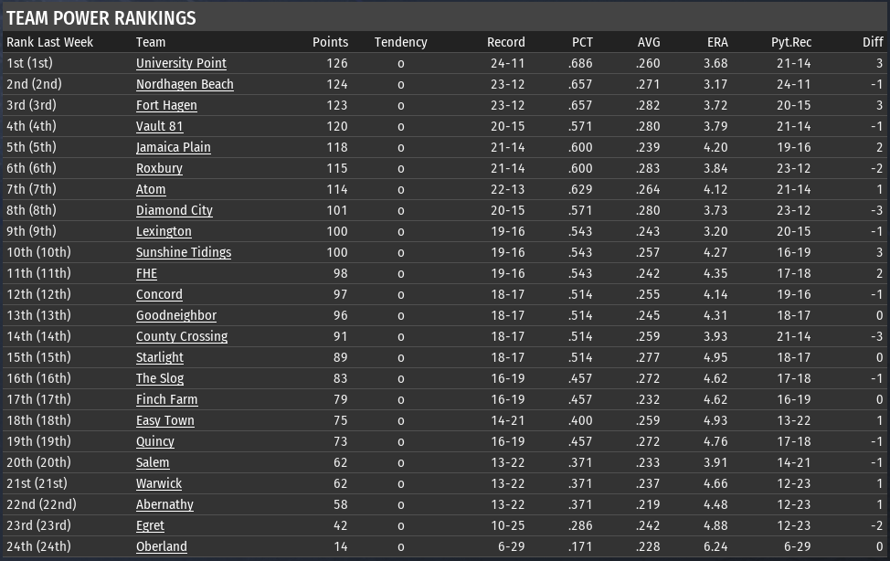 BNN Weekly Report This Week in the CBO, BMU, and GBRL by Nat Wright-Kawolski 19 May 2302 Week's Results Players of the Week NCA - RF Jonathan Angelou, Nordhagen Beach, 10/19, 2 HR, 6 RBI SCA - RF Tomas Jones, University Point, 11/20, 4 HR, 8 RBI Interesting PotW dynamics here since Tomas Jones was traded away because of the emergence of Jonathan Angelou. Daily Top Players 5/13 - LF Young Goodman, Roxbury, 3/3, 2B, HR, 4 RBI, R, BB 5/14 - RF Matt Marketman, Warwick, 3/4, 2B, 3B, HR, 2 RBI, 4 R, BB 5/16 - SP Curt Redcoats, Sunshine Tidings, 9.0 IP, 0 H, 0 ER, 2 BB, 3 K, W, No-hitter 5/17 - RF Jonathan Angelou, Nordhagen Beach, 4/4, 2B, 2 HR, 4 RBI, 3 R, BB 5/18 - CF Earthbound Bussey, 4/4, 2 2B, 2 HR, 8 RBI, 3 R, BB Transactions Monday, May 19th , 2302 Warwick Mirelurks: Placed 2B Bubb Islander on the 7-day injured list, retroactive to 05/18/2302. Sunshine Tidings Chemists: Signed free agent LF Mop Lopez to a minor league contract. Fort Hagen Silver Shroud: Signed RP Josh Kemp. Fort Hagen Silver Shroud: Signed RP Brady Petropo. Fort Hagen Silver Shroud: Signed RP Polly Jolly. Sunshine Tidings Chemists: Released LF Fernando Z. Fort Hagen Silver Shroud: Released RP Polly Jolly. Fort Hagen Silver Shroud: Released RP Brady Petropo. The Oberland T-51s traded 32-year old RHP Freedom Williams to the University Point Deathclaws, getting 25-year old RHP Gary Stallworth, 25-year old C Surf Jardine, 18-year old minor league 1B Judge Sharp, 22-year old minor league RHP Ronnie Messenger, and 24-year old minor league RHP Bobby Lidtke in return. The Oberland T-51s traded 25-year old C Surf Jardine to the County Crossing Bloodbugs, getting 23-year old minor league 2B Jax Stoneman, 21-year old minor league RHP Rouge Iorres, and 18-year old minor league SS Justin Tootles in return. Sunday, May 18th , 2302 Lexington Synths: Activated SP Zach DiGrande from the injured list. Lexington Synths: Sent SP Zach DiGrande to Triple A Union Hope for injury rehab. Diamond City Swatters: Released LF Mop Lopez. Jamaica Plain Red Rockets: Signed 1B Troy Kisspeople. Warwick Mirelurks: Signed LF Ape Murtagh. Oberland T-51s: Signed RP Cody Graca. Jamaica Plain Red Rockets: Released 1B Troy Kisspeople. Saturday, May 17th , 2302 Nordhagen Beach Party Boys: SP Julian Shed returns from his rehab assignment. Starlight Lady Killers: Placed 1B Zeldolph Violet on the 7-day injured list, retroactive to 05/16/2302. County Crossing Bloodbugs: Placed RF Babs Rooth on the 7-day injured list, retroactive to 05/16/2302. Jamaica Plain Red Rockets: Activated SP Chris Teddybear from the injured list. Warwick Mirelurks: Placed 3B Aaron Sinn on the 7-day injured list, retroactive to 05/16/2302. County Crossing Bloodbugs: Signed RF Billy Yudkowsky. Warwick Mirelurks: Signed LF Keith Beaker. The Oberland T-51s traded 31-year old RHP Matt Udder to the Quincy Gunners, getting 18-year old minor league SS Bill Mahan and 20-year old minor league CF Da Game in return. The Rayburn Point Patcheyes traded 35-year old SS Josh Wanty and 18-year old minor league 1B Dax Robledo to the Lexington Synths, getting 31-year old minor league 1B Grant Mercenary in return. Thursday, May 15th , 2302 Abernathy Adamantium: Placed C Jimjames LaFleur on the 7-day injured list, retroactive to 05/14/2302. Salem Witch Hats: Placed 2B Dan Ackerman on the 7-day injured list, retroactive to 05/14/2302. Atom Cats: Activated RP Mike Waterdrinker from the 60-day injured list. Atom Cats: Sent RP Mike Waterdrinker to Triple A Cabot House for injury rehab. Jamaica Plain Red Rockets: Signed 1B Peter Kaprielian. Abernathy Adamantium: Signed C Brad Flanagan. Wednesday, May 14th , 2302 Warwick Mirelurks: Placed CF Ginger Rogers on the 7-day injured list, retroactive to 05/13/2302. Warwick Mirelurks: Placed SP Brian Bridges on the 7-day injured list, retroactive to 05/13/2302. Standings Team Power Rankings Weekly Team Power Rankings: Here are the current team power rankings for Commonwealth Baseball Organization: Analysis There are some heavy risers and fallers this week with the polar opposites being Vault 81's nine-game winning streak, while Oberland is falling further into Oblivion with a nine-game losing streak. The T-51s have been so bad that Commissioner Nate Howard has stepped in to help them become a little more competitive. That will not happen in 2302, but we will feature the T-51s and looks at how one of the strongest teams at the beginning of the CBO may be its worst ever in 2302. For the rest, let's take a look at the BNN Top 5. #1 University Point - The Deathclaws reclaimed the top spot after a 4-1 week with a split at Egret (#23) and a sweep of Warwick (#21). On the negative side, the Claws are a but banged up and got even worse news that they will not have C Shawn Cherry (.316/1/8) until late August after he suffered a severe ankle injury. They may need to make a move for a catcher since promoted C James Lebron is not considered to be a CBO-level catcher at this point. #2 Nordhagen Beach - The Party Boys did not dominate, but they did have a decent 3-2 week in splitting with Concord (#12) and winning two of three over County Crossing (#14). RF Jonathan Angelou earned Player of the Week honors, and the Boys are probably going to run away with the Brotherhood League. Now with a five-game lead over second-place County Crossing, Nordhagen Beach will probably not look back with the NCA's 2nd-best runs scored and the CBO's best in runs allowed. #3 Fort Hagen - The Silver Shroud remain on pace with Nordhagen Beach for the NCA's top record with a 4-1 week. The Shroud split with Salem (#20) and then swept the reeling Abernathy Adamantium (#22). Fort Hagen also has a comfortable lead in the Institute League, leading both Lexington (#9) and Sunshine Tidings (#10) by four games. #4 Vault 81 - As mentioned in the introduction, the Vault Dwellers have won nine straight, including all five this week on the road. Vault 81 won both games at Quincy (#19) before dismantling the Ninjas on the w