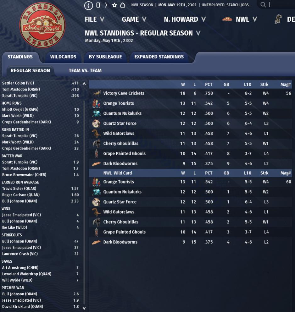 19 May 2302 ---------------------------------------------------------- Nuka News Update Reporting on the NWL, NWLB, and APYL Leagues by Evan Guy Victory Hopping Ahead The Victory Cave Crickets continues their winning ways, going 5-1 on the week, including winning the last four on their schedule to burst ahead to a 5-game lead in the NWL. Victory (18-6) won two of three at Dark (9-15) and then swept Quartz (12-12) for their lead. Orange used a four-game winning streak to end the week for the current wild card lead. The Tourists (13-11) lost their first two games of the week against Quantum (12-12) before defeating the Nukalurks in the last game and then winning all three versus Grape (10-14). 1B Keychain Colvin of the Nukalurks was the Player of the Week. He was 12 for 27 on the week with five homers and five RBI, meaning all home runs were solo shots. Standings APL and BBL In the Amusement Park League, the Nuka Bottling Plant Pack (Quantum) won their final five games of the week to break a five-game losing streak and maintain first place at 14-10. Kiddie Kingdom (Grape) is the only other team above .500, placing them in second place. CF Matt Little of Dry Rock Gulch (Dark) was the Player of the Week. Little collected 11 hits in 24 at bats for a .458 average. He also accounted for 9 RBI, 2 HR, and 8 runs. In the Bradberton Boys League, the Fizztop Mountain Conquerors continue to be the top team thanks to having the league's top player. Fizztop Mountain has a 13-4 record, three games ahead of the Wixon Shovels (10-7). The Ol' Sugartop Buckaroos and the South Bradberton Tycoons both have the worst records at 6-11 each. 1B Os Cazadore of the Conquerors continues to dominate. On the week, he was 11 for 23 for a .478 average with five homers, 8 RBI, and 10 runs. Vim! View Veracious, Vivacious, Vainglorious Vision of the Vim! Leagues by Vikky Vail Standings Analysis This is becoming deja vu. Rayburn Point (22-13) is still atop the Fog Division while the Dalton Farm Fog Crawlers (23-12) stay atop yet again in the Harbor Division. The Patcheyes have won their last six games, with second-place Echo Lake (19-16) losing their last three. Both Rayburn Point and the Harbormen were tied atop the division just three days ago. The Patcheyes won the last three games of their four-game series against Grand Hotel to start the week and then won the first three games against Eden Meadows. That series concludes today. The Fog Crawlers went 4-2 on the week, starting by winning their last three games at Acadian in a four-game series. Then, they won only one of the first three games at Far Harbor. As of today, the Fog Crawlers hold a one-game lead over the Acadians. Player of the Week LF James Darling, Dalton Farm, 10/24 (.417), 2 HR, 12 RBI, 6 R MDIL Report More deja vu. The Southwest Harbor Rippers (Echo Lake) of the Small Bertha Division and the Huntress Island Ug-Qualtoths (Dalton Farm) of the Old Longfellow Division are both at the top of their divisions at 23-15. CF Jerry Stokesfire, Glowing Grove Brainiacs (Brooke's Head) was 11 for 24 with 3 home runs and 10 RBI to earn Player of the Week honors. MYL Report In the Mount Desert Island Four, the Far Harbor Dockdwellers (10-7) lead by a game over the National Park Rangers. In the Great Diamond Island League, the Diamond Cove Knights, the Pleasant Cove Raiders, and the Echo Point Glowers are all tied for first at 9-8. In the MDIF, LF John Echolake, National Park, was the Player of the Week. He was 10 for 19 with five homers and 12 RBI. In the GDIL, Echo Point's SP Kevin Humphrey was the top player. Humphrey went 2-0 on the week in 10.2 innings. He struck out 5, held a 0.84 ERA, and held batters to a .200 average on the week.