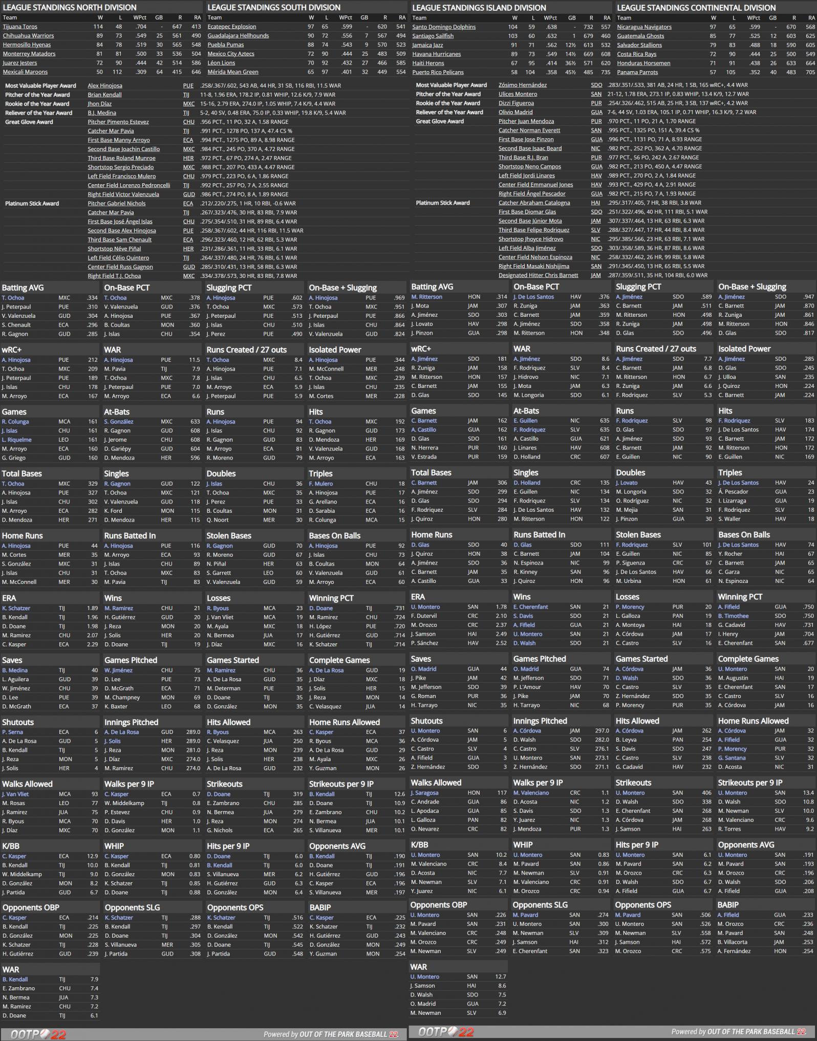 Puebla’s Alex Hinojosa won his third MVP with a league best 1.022 OPS and 10.7 WAR. Juarez pitcher Nick Bermea won his third Pitcher of the Year and became the third pitching Triple Crown winner in CABA with a 24-9 record, 1.84 ERA, and 365 strikeouts. In Liga Caribe, Santo Domingo won their first-ever division title. The Dolphins finished with 747 runs, 103 ahead of next best, to finish 99-63. Jamaica had another great season but was just short at 97-65, while last year’s CABA Champ Santiago was third at 89-73. Diomar “Top Dog” Glas won his first MVP, with the 26-year old Curacaoan outfielder leading the league in runs (114), homers (50), RBI (121), and OPS (1.001). In the Continental Division, Salvador won the title at 93-69 for their third straight playoff berth. Veteran American pitcher Matt Newman won PotY for the Stallions with a 0.80 WHIP, 1.92 ERA, and 26-7 mark. Newman became the first player to win his position’s top award in both CABA and MLB, as he won Pitcher of the Year in the National Association with Boston in 1913. Santo Domingo would easily take the league title, defeating the Stallions in five games. In the CABA Championship, the Dolphins handled Tijuana in five games for their first title, the second straight by a Dominican team, and third straight for the Caribbean. Glas earned series MVP and had 19 hits, 10 runs, 6 doubles, and 4 homers over 10 playoff games. Other notes: Santo Domingo also had pitcher Dave Walsh throw CABA’s third-ever perfect game, striking out 11 against Honduras on June 20. Jamaica pitcher Alejandro Cordova became the first CABA player to record 2000 career strikeouts.