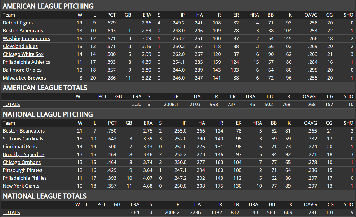 Well, there should be no question who the best pitcher in MLB is right now. Rube Waddell has the top 2 spots on the Game Performance list (both games with 88 Game Score), he also has the 18th top spot for the month. Boston ace Noodles Hahn also has 3 spots on the Top-25 list, with a 4th, 12th, and 23rd finish.