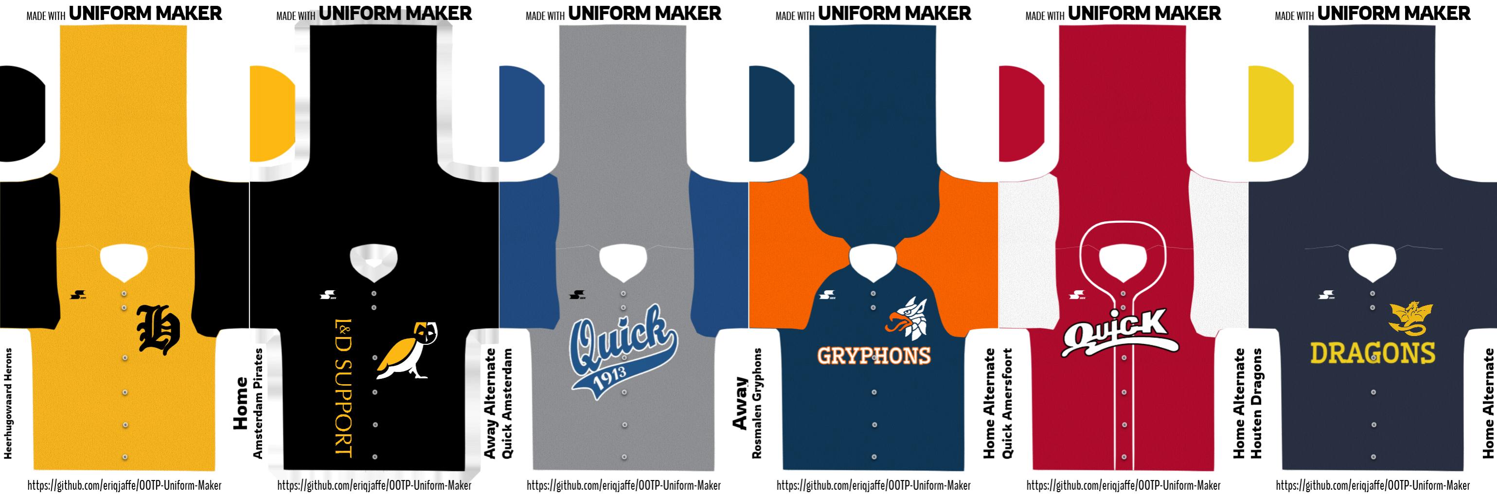 What an absolutely brilliant program Eriq. Just wow! Can't believe how easy it is now to make your own uniforms. Without this program there would be no way I could make my own uniforms. I have been using the program for a few days now and have made quite a few already. Below a sample of some of the uniforms I've made. Once you get going you can make 'm pretty quickly. Uniforms and logos really bring a league to life, it makes a massive difference how a league feels with good logos and unis. These uniforms will complete my fictional league. Thanks eriq, you are the man!