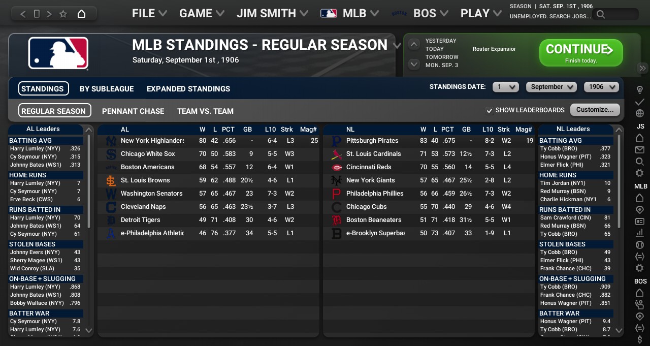 -AL Best Batter award: RF Harry Lumley of the New York Highlanders with 7 home runs, 81 RBIs, and 91 runs scored. -NL Best Batter award: CF Ty Cobb of the Brooklyn Superbas with 2 home runs, 66 RBIs, and 65 home runs. -NL Triple Crown: SP Rube Waddell of the Pittsburgh Pirates, with a 26-13 record, a 1.58 ERA, and 274 strikeouts Awards for September: 2B Del Howard of the Chicago White Sox wins the AL Batter of the Month Award. 3B Harry Steinfeldt of the Cincinnati Reds wins the NL Batter of the Month Award. SP Charley Hall of the Boston Americans wins the AL Pitcher of the Month Award. SP Ed Willett of the St. Louis Cardinals wins the NL Pitcher of the Month Award. SP Charley Hall of the Boston Americans wins the AL Rookie of the Month Award. SP Ed Willett of the St. Louis Cardinals wins the NL Rookie of the Month Award. The matchup for the 1906 World Series is another rematch with the New York Highlanders (99-55) vs. the Pittsburgh Pirates (95-59)!!! |
