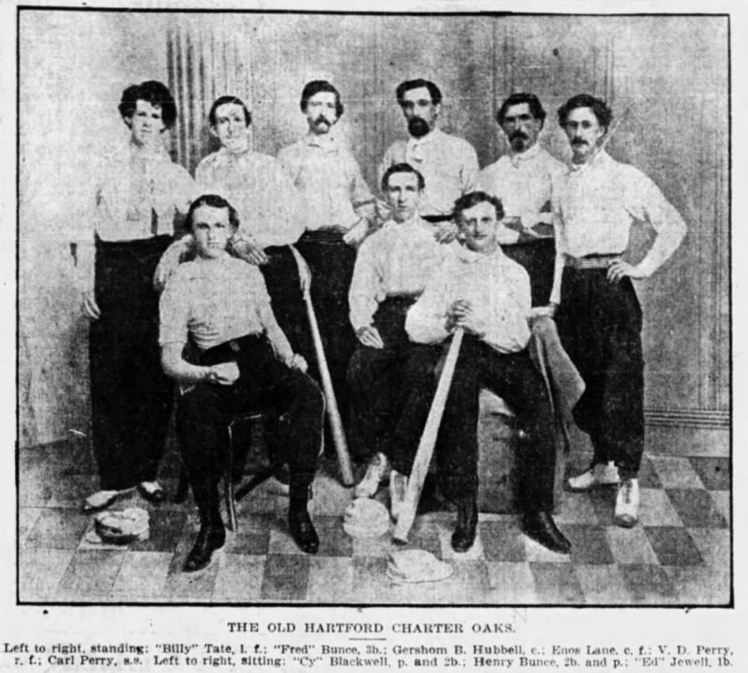 Top row (left to right): Billy Tate (LF), Fred Bunce (3B), Gershom Hubbell (C), Enos Lane (CF), V.D. Perry (RF), Carl Perry (SS)